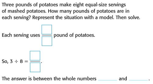 Sample Answer: 2/5 pound of potatoes ; answer is between 1 and 2