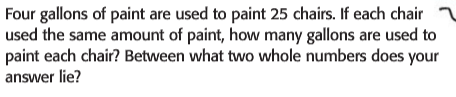 Sample Answer: 1/4 gallon ; answer is between 3 and 4