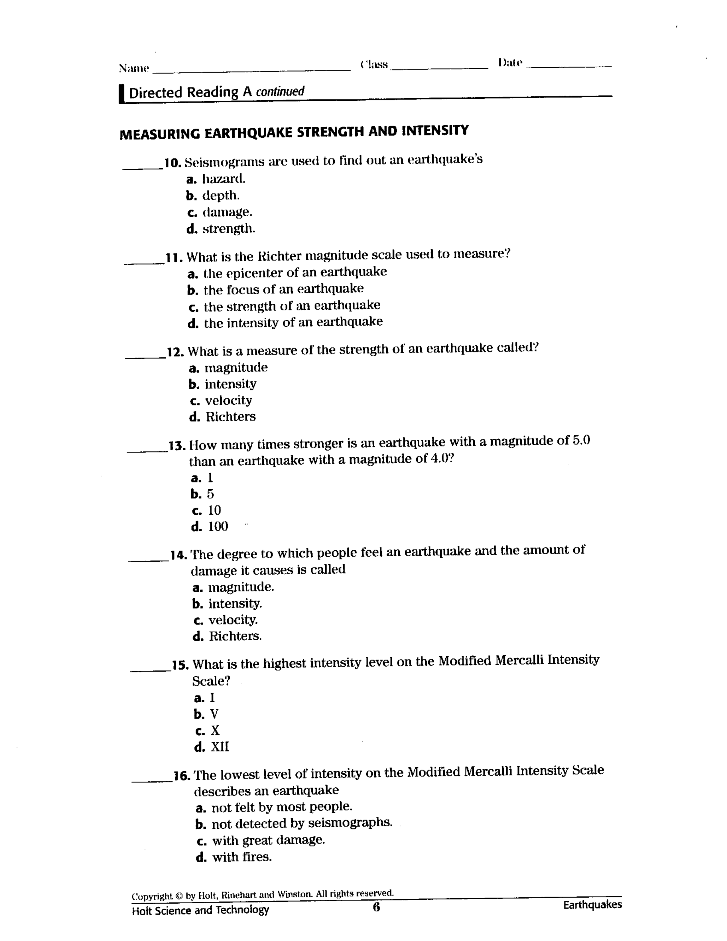 Earthquake Measurement Worksheet
