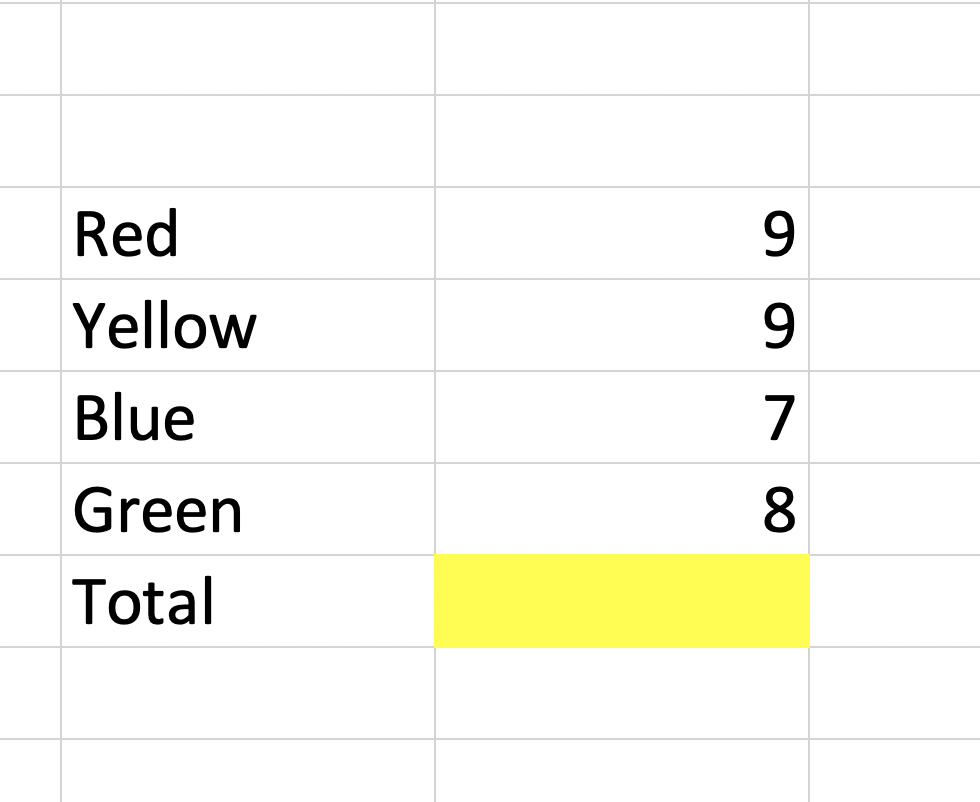 The Excel image above shows the number of red, yellow, blue and green M&M's in a bag. In the space below, write the EXCEL formula you would use to calculate the total number of M&M in the Bag