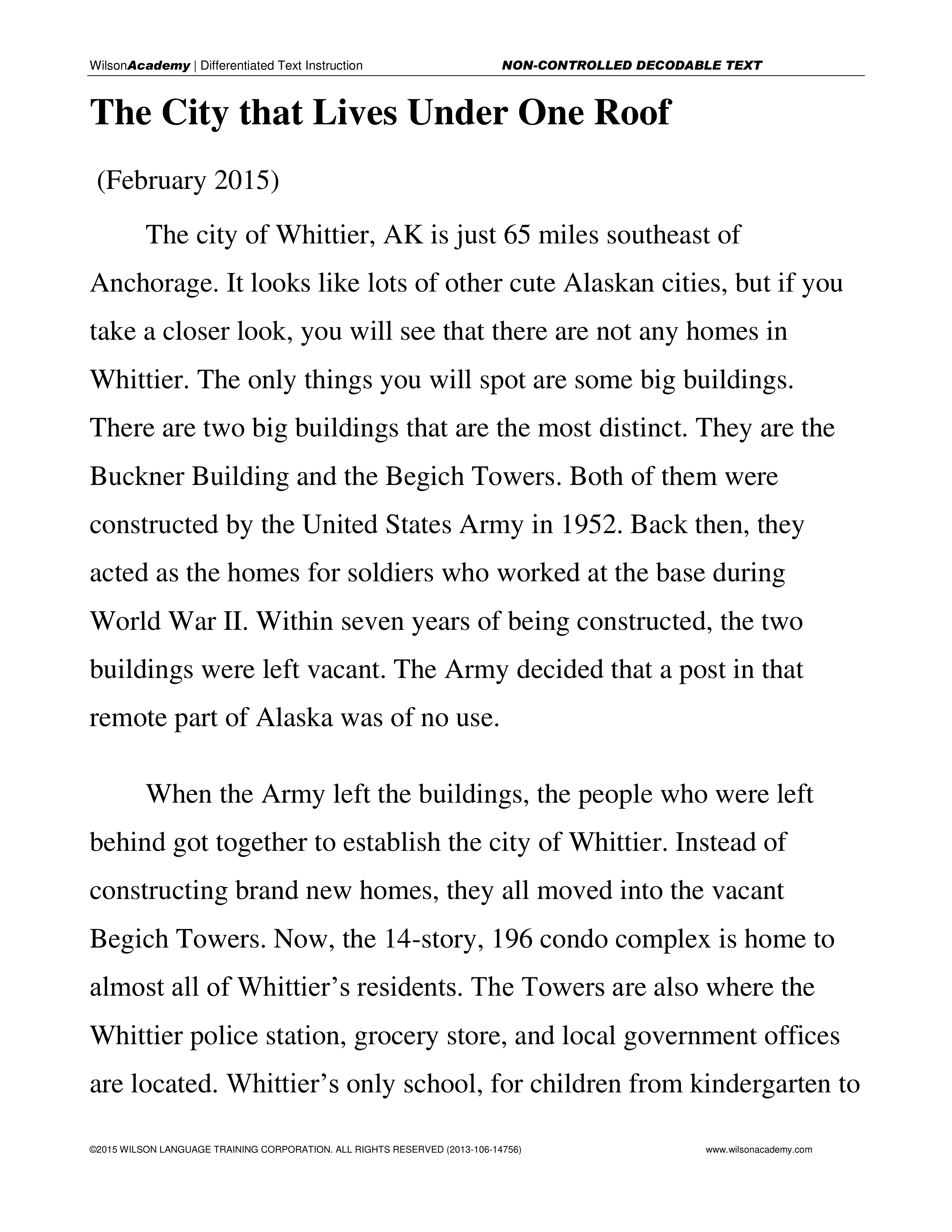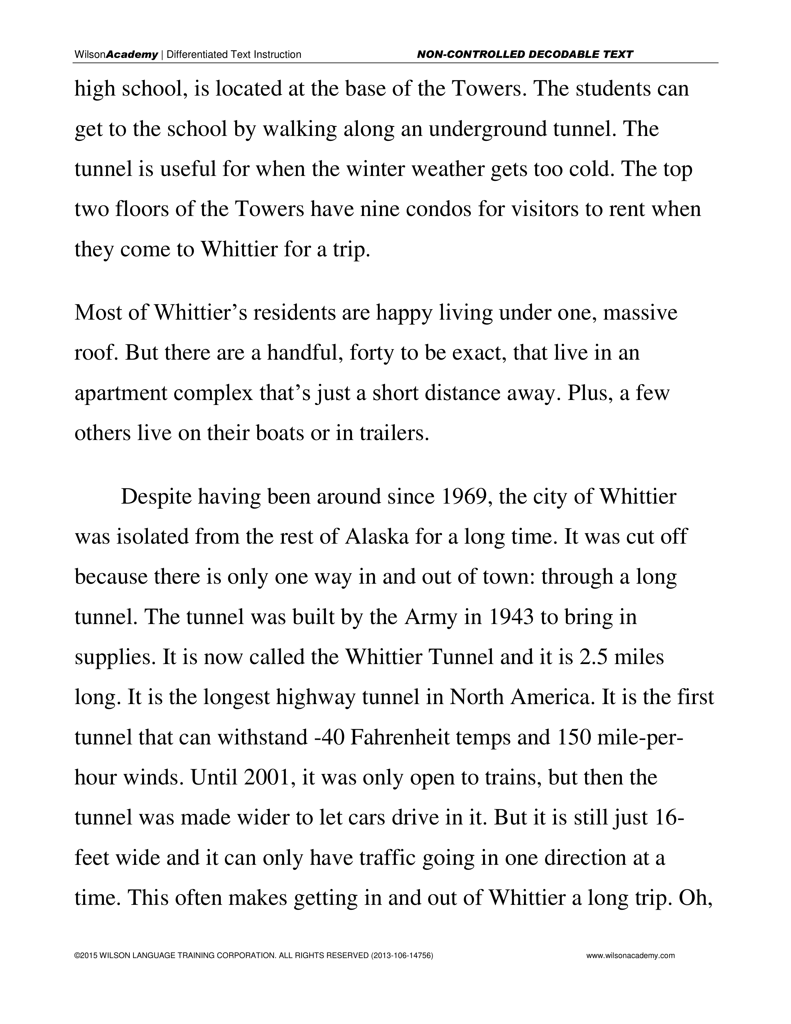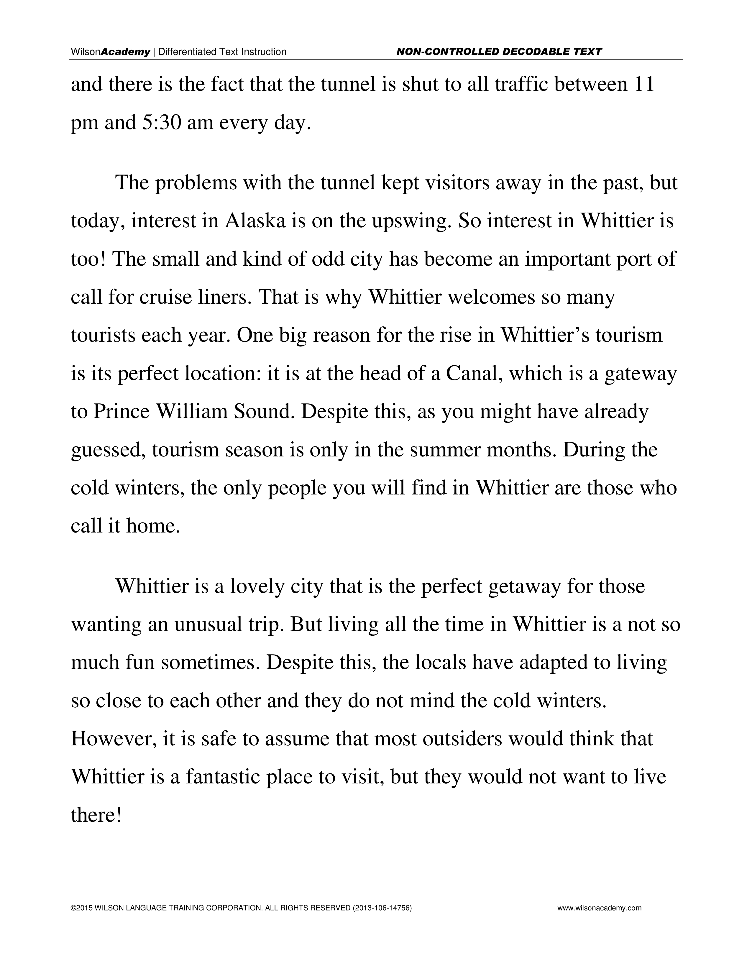 What are three things that make living in Whittier, AK different from other places in the United States. Explain in at leat 2 complete sentences.