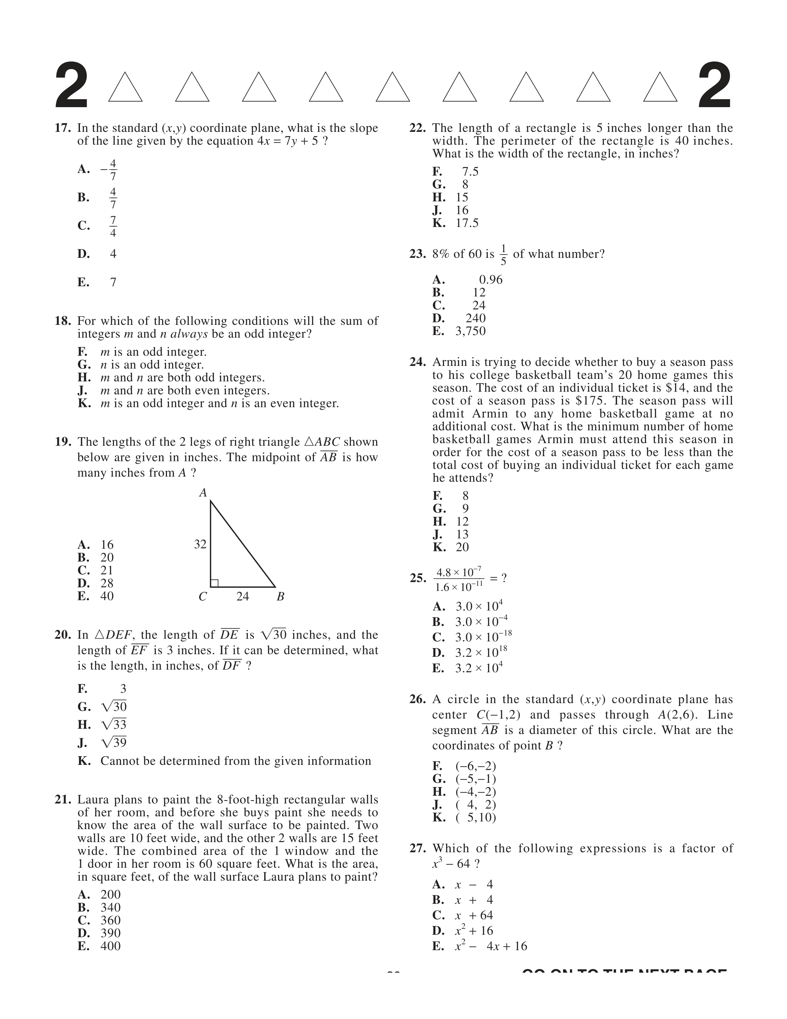 Test questions are taken from the 2019-2020 "Preparing for the ACT Test" booklet. A full answer key for the math section can be found on page 58.