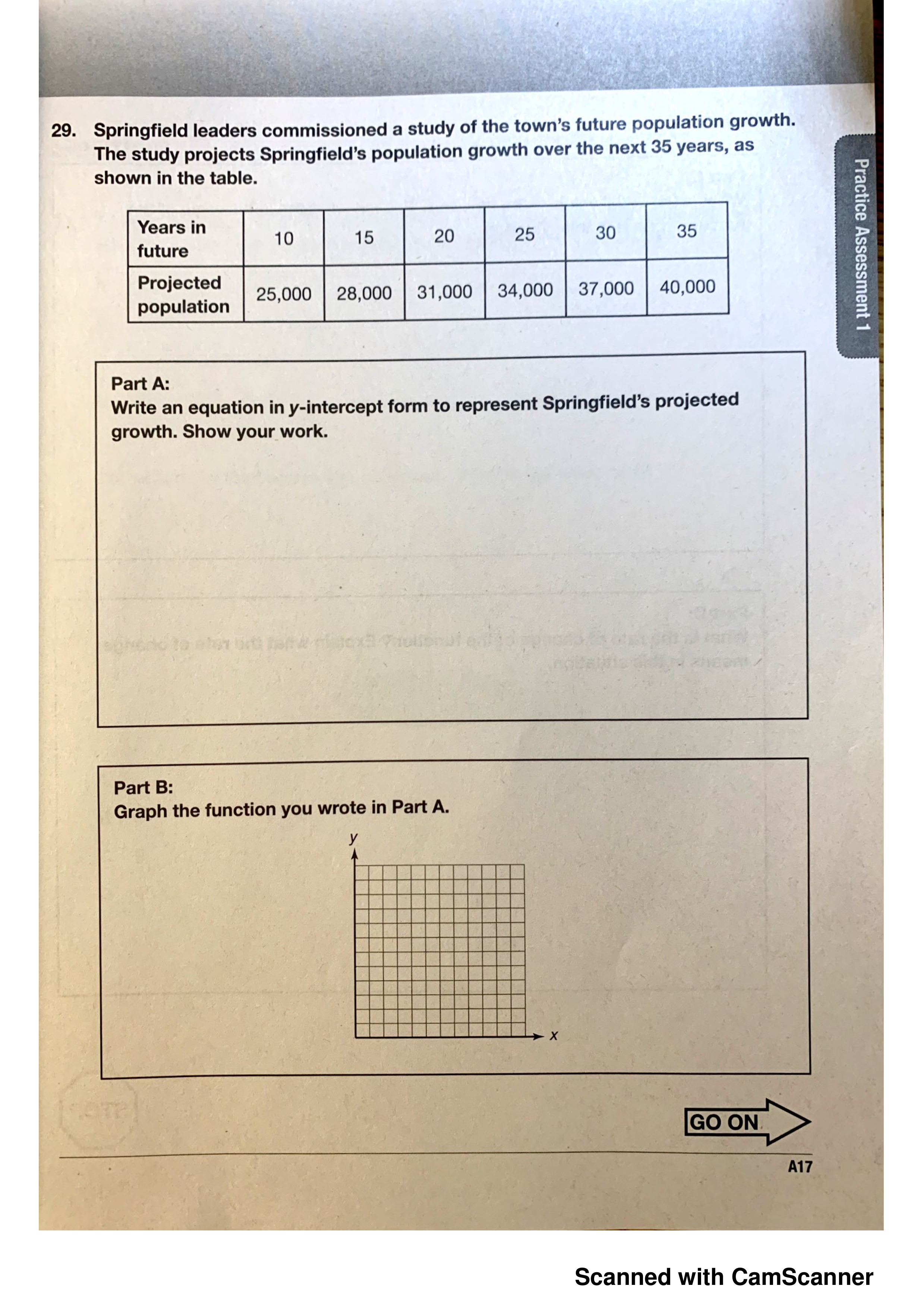 Write an equation in y-intercept form to represent Springfield's projected growth. Show your work. (ANSWER BOTH PART A & B)