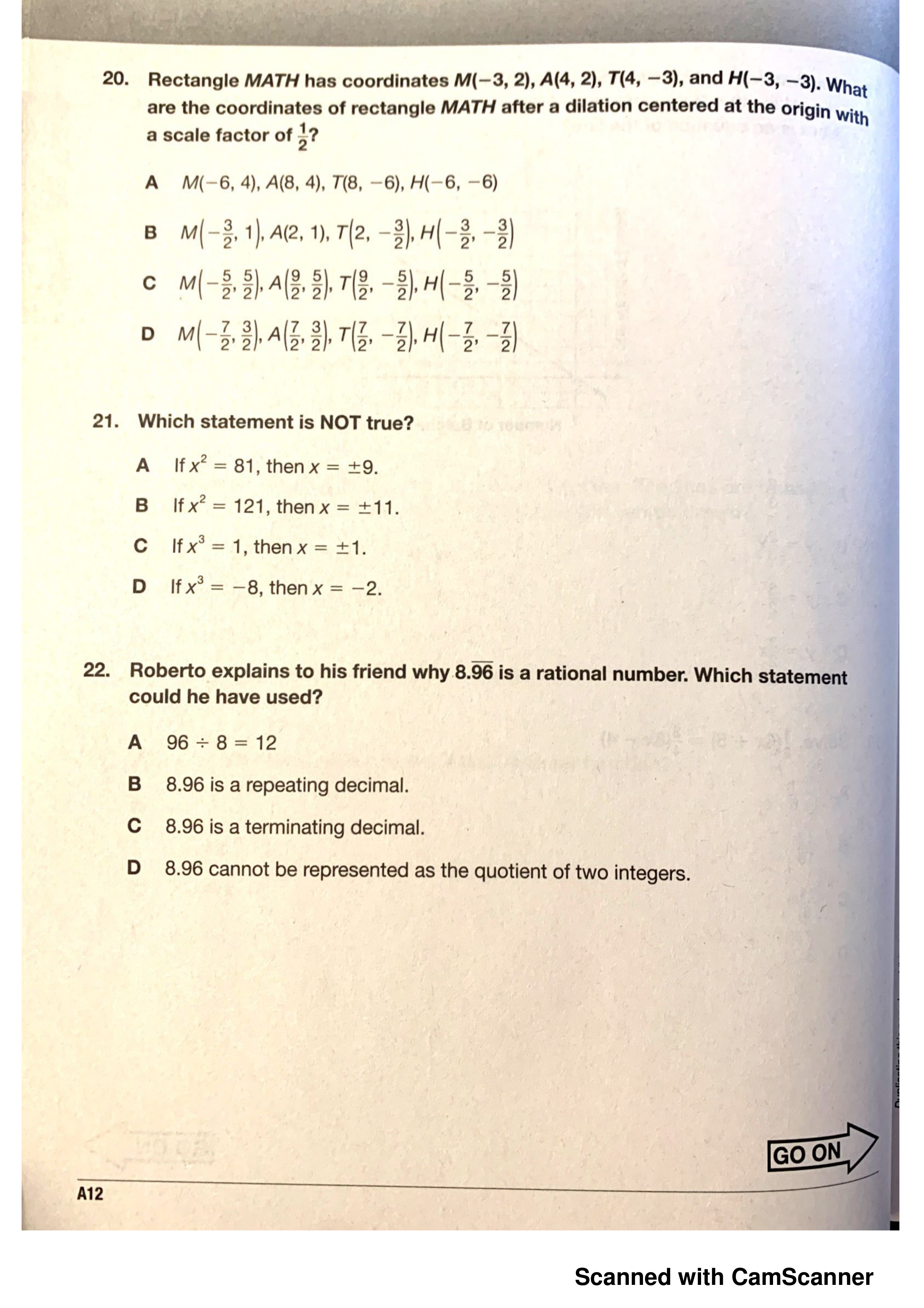 What are the coordintes of rectangle MATH after a dilation centered at the origin with a scale factor of 1/2?