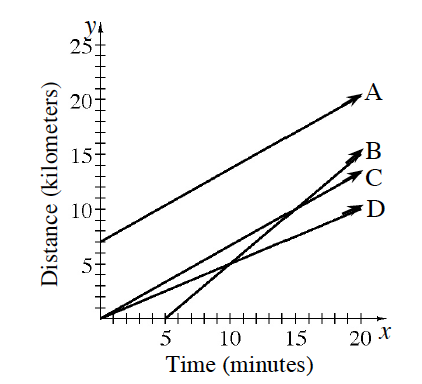 Lydia wants to describe each bicyclist’s rate in kilometers per minute for an article in the school paper. To do this, she sketched triangles like the one for line A on the graph below.