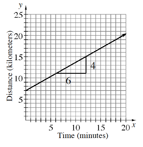 These numbers can be written as a rate in kilometers per minute to describe the distance the bicyclist rides as time passes. The fraction 4/6 represents how the graph of the line goes up 4 units for every 6 units that it moves to the right. The number 4/6 is called the slope of the line.