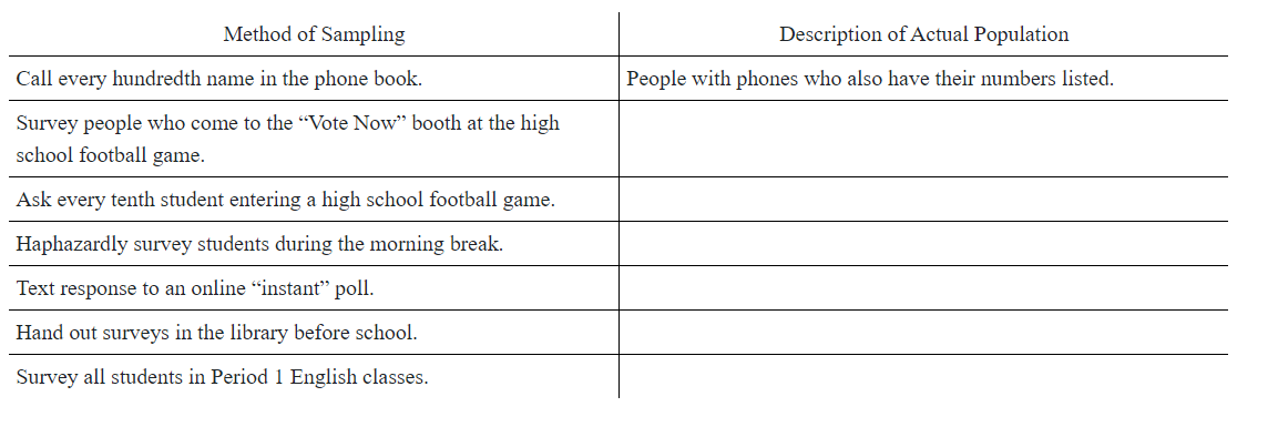 From what population is each of these samples taken? Write down the actual population for each of these sampling techniques.
