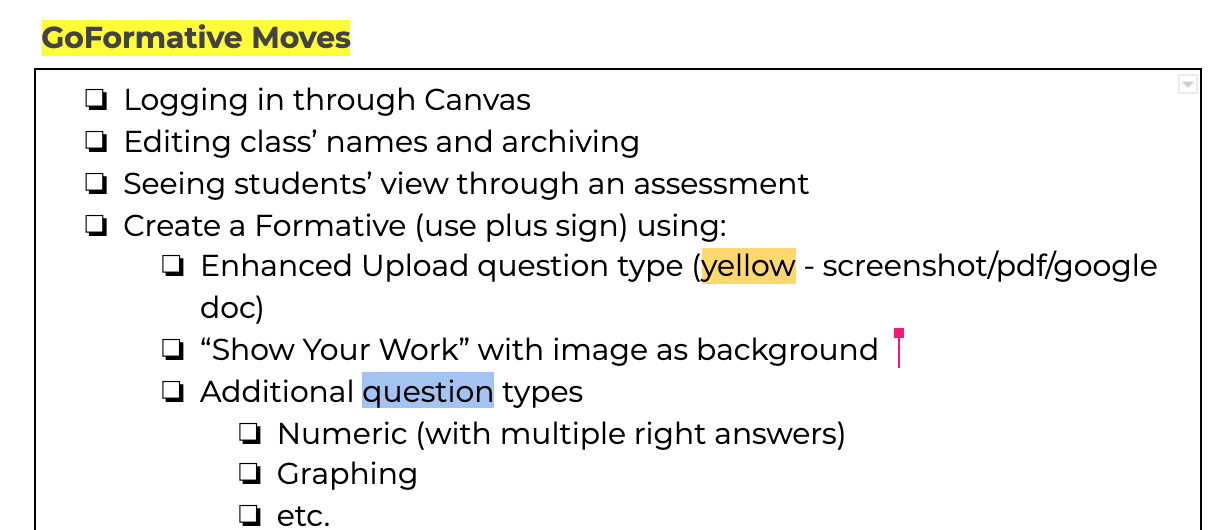 My name is Nick Hershman ("he/him" pronous) - I am a Math TOSA in T&L. I was a teacher in Brooklyn, NY; Manizales, Colombia; Portland and Beaverton prior to my current job in T&L. I believe that good formative assessment is valuable and today I'm excited to learn with you about how you give formative assessment and the ways in which GoFormative can make assessment more efficient (combining auto-graded and teacher graded items) and timely (give you access to work in real-time, recording and keeping track of results).