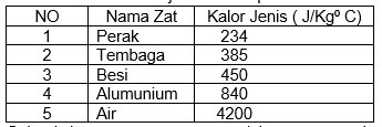 Perhatikan tabel kalor jenis beberapa zat berikut!