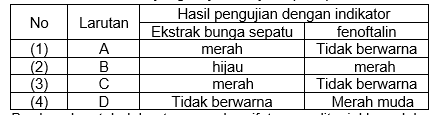Ekstrak bunga sepatu awalnya berwarna ungu, fenoftalin awalnya tidak berwarna. Setelah ditambah zat yang diuji hasilnya seperti pada tabel berikut.