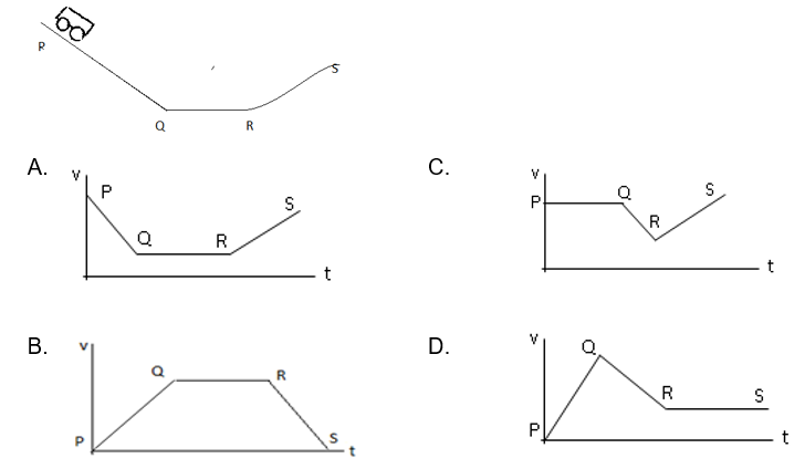 Jika lintasan licin, maka grafik v-t yang menggambarkan gerak troli dari P ke S adalah ….