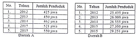 Perhatikan tabel pertambahan jumlah penduduk pada dua daerah yang luas wilayahnya sama berikut ini!