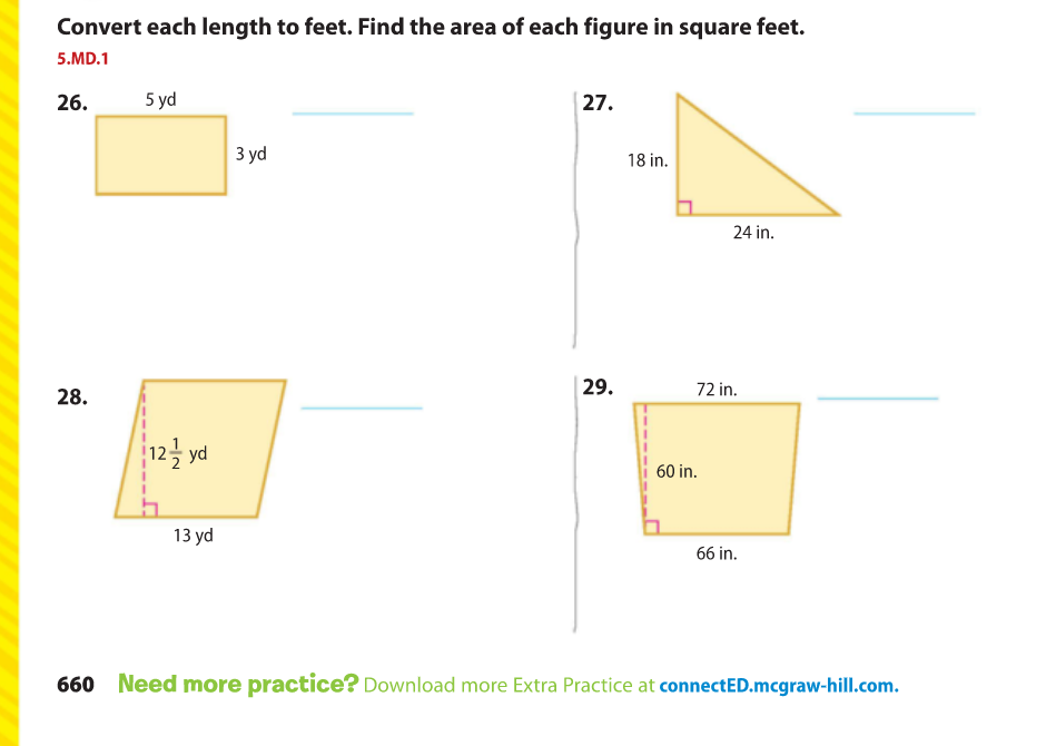 Convert each length to feet. Then find the area of each figure. Copy and paste ft² for the units.
