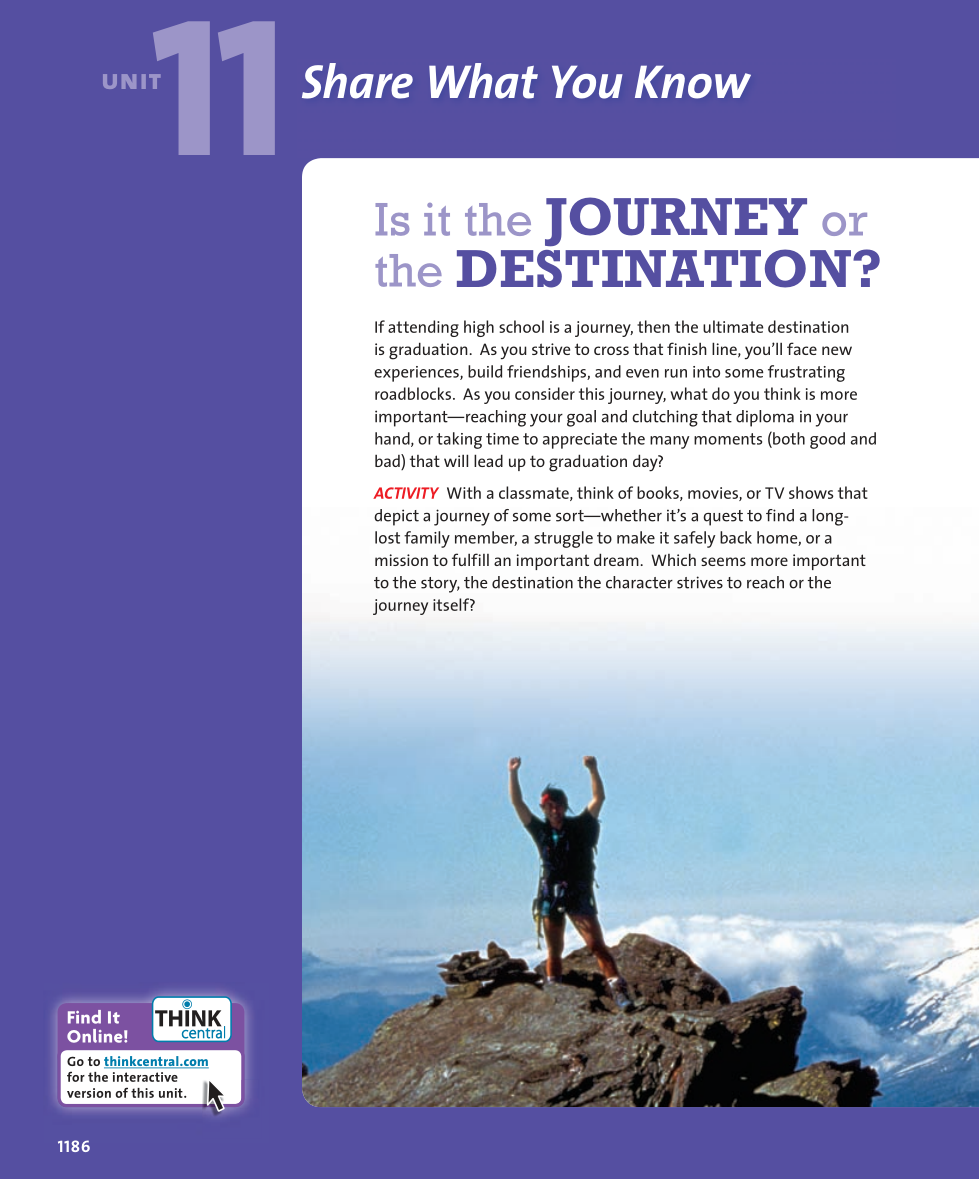List book,, movies, or TV shows that depict a journey of some sort (list about 4); Then, respond: Which seems more important to the story, the destination the character strives to reach or thejourney itself?
