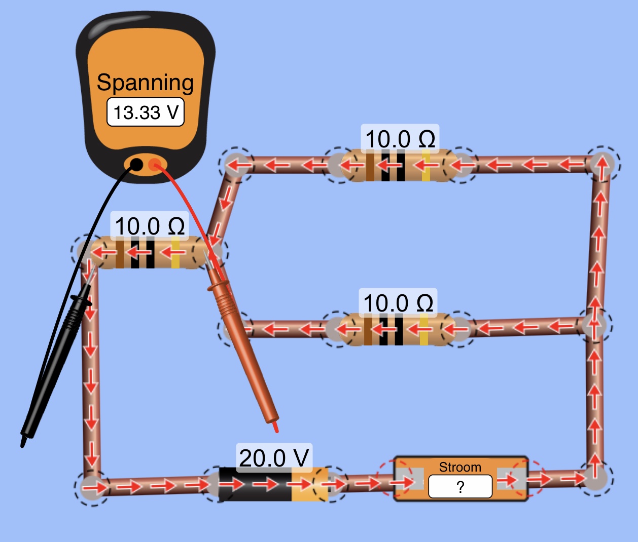 Leg aan de hand van de spanningswet van Kirchhoff uit hoe groot de spanning over de bovenste weerstand moet zijn.