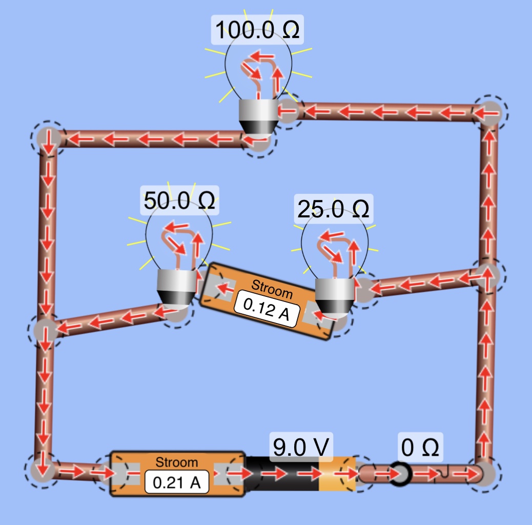 Pas de stroomwet van Kirchhoff toe op het rechter kruispunt en bepaal hoe groot de stroomsterkte door het bovenste lampje is.
