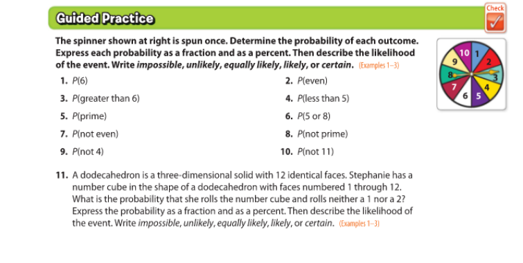 Express the probability as a fraction AND a percent. Then describe the likelihood as impossible, unlikely, equally likely, likely or certain. EX of formatting: 3/4, 75%, likely