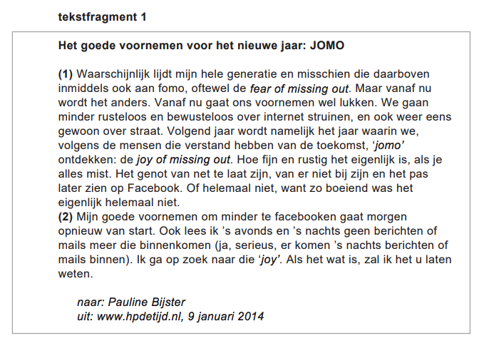 De auteur van tekst 1 legt zichzelf een bepaalde beperking op. De auteur van tekstfragment 1 doet dat ook. Deze beperkingen lijken bedoeld om de nadelige invloeden van fomo te verminderen.