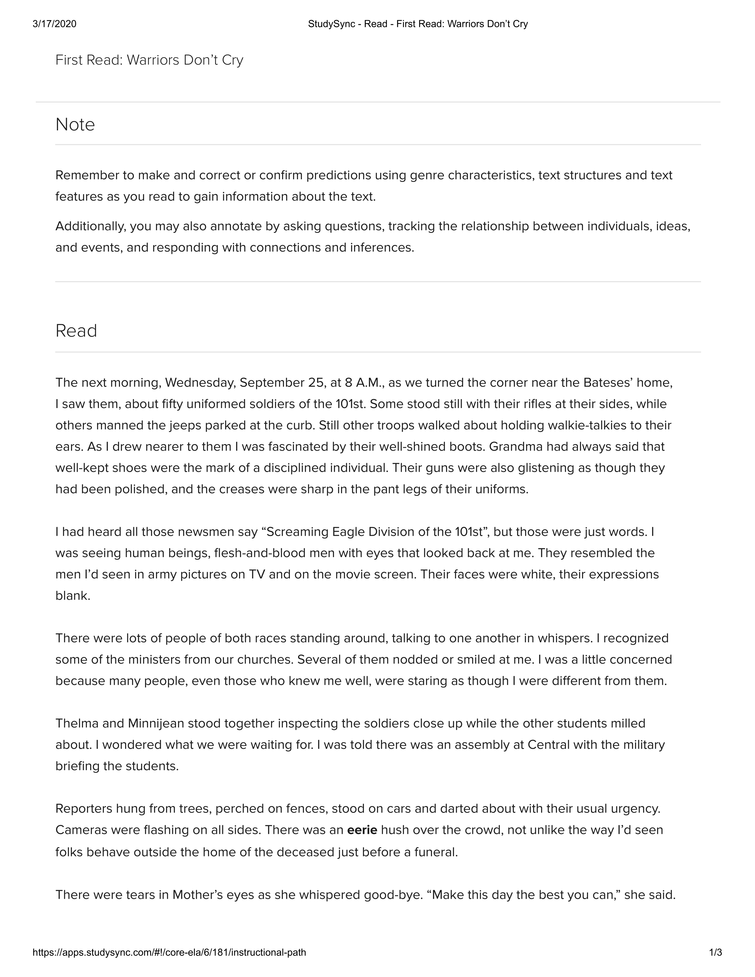 What does the narrator mainly notice about the uniformed soldiers in the first paragraph?The next morning, Wednesday, September 25, at 8 A.M., as we turned the corner near the Bateses’ home, I saw them, about fifty uniformed soldiers of the 101st. Some stood still with their rifles at their sides, while others manned the jeeps parked at the curb. Still other troops walked about holding walkie-talkies to their ears. As I drew nearer to them I was fascinated by their well-shined boots. Grandma had always said that well-kept shoes were the mark of a disciplined individual. Their guns were also glistening as though they had been polished, and the creases were sharp in the pant legs of their uniforms.