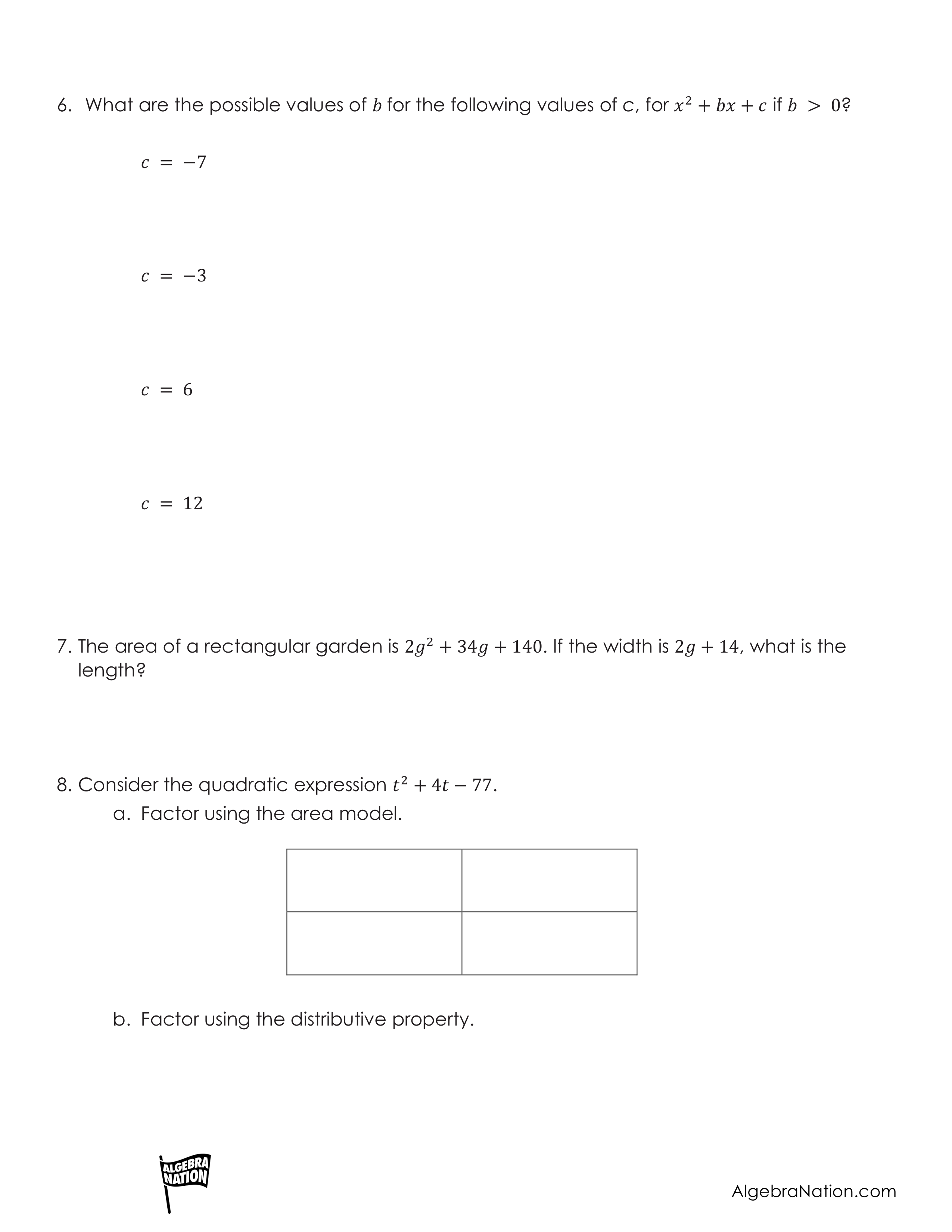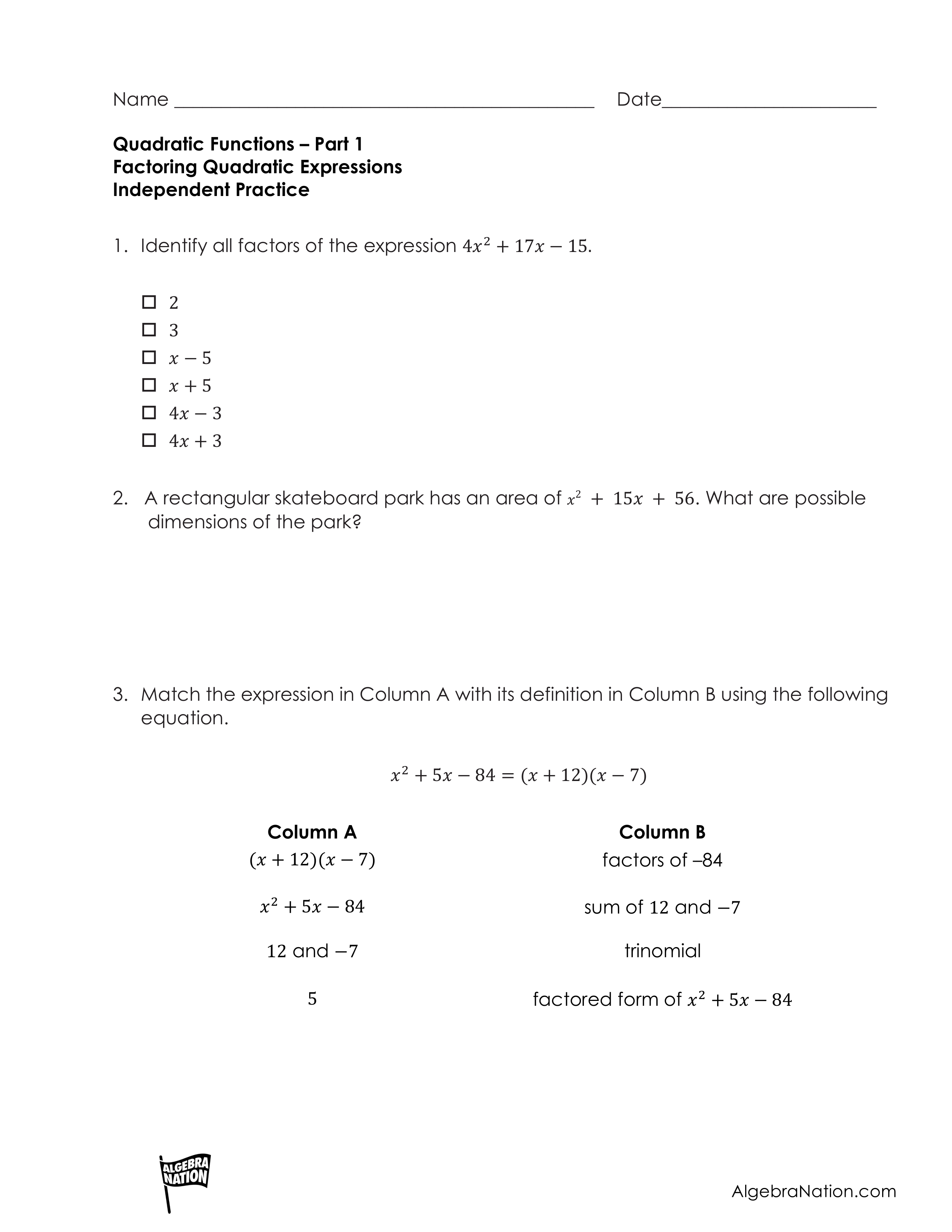 Factoring Quadratic Expressions Independent Practice