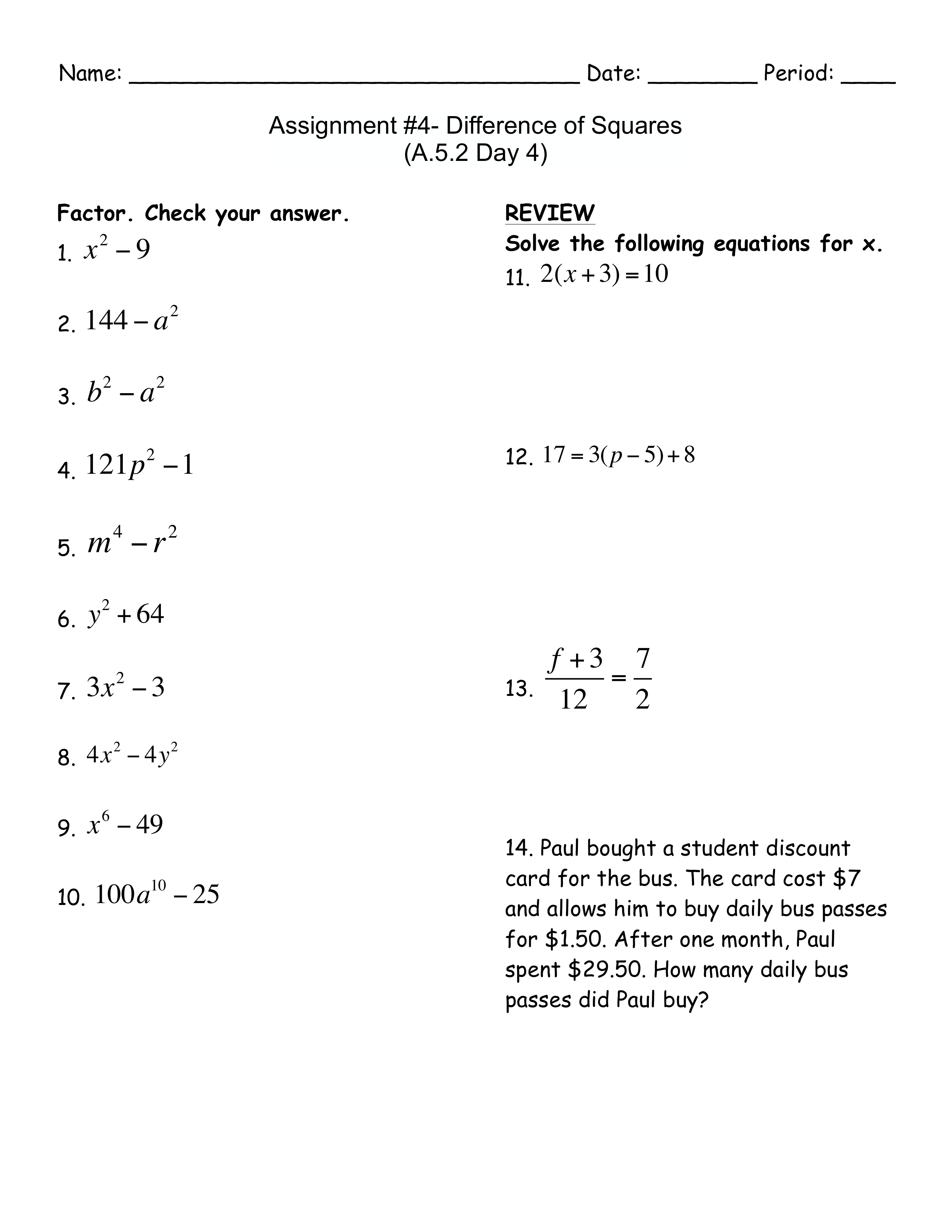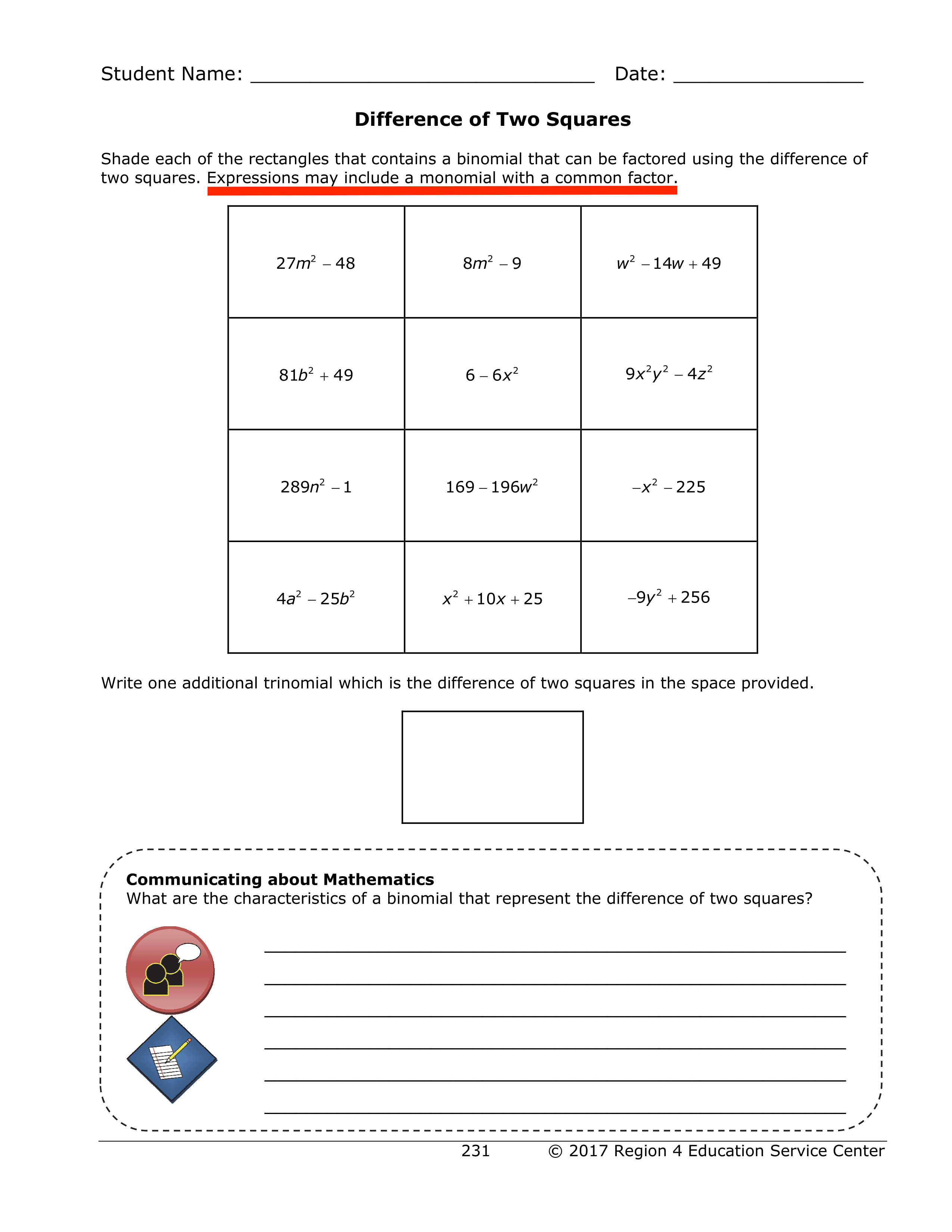 List THREE (3) binomials that are a difference of squares. There are seven (7) expressions that could be the answer.