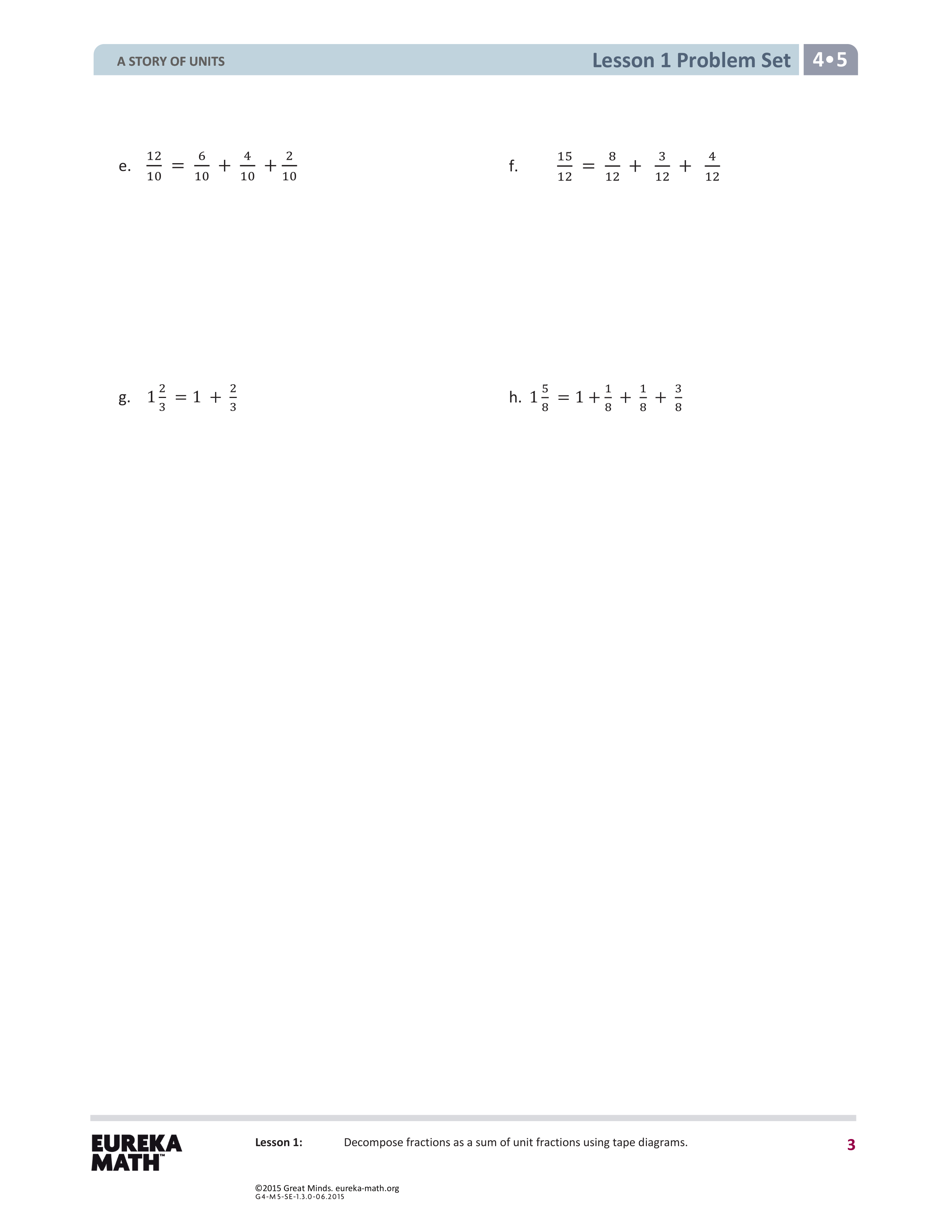 If you have the same number of parts on the top and the bottom, this equals 1. Write the fraction with the same numerator (top) and denominator (bottom) to equal 1.