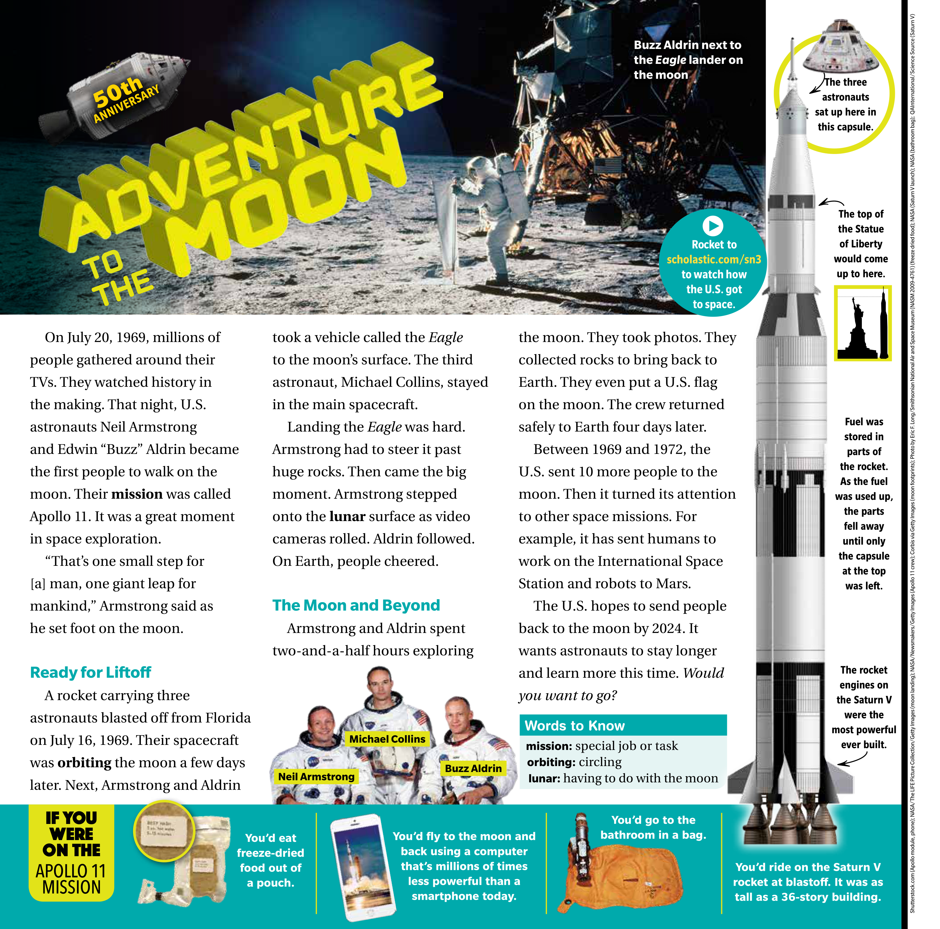You read about how Neil Armstrong and Edwin “Buzz” Aldrin went to the moon 50 years ago. Use the article to create your own story about visiting the moon. Make sure to include details from the article.
