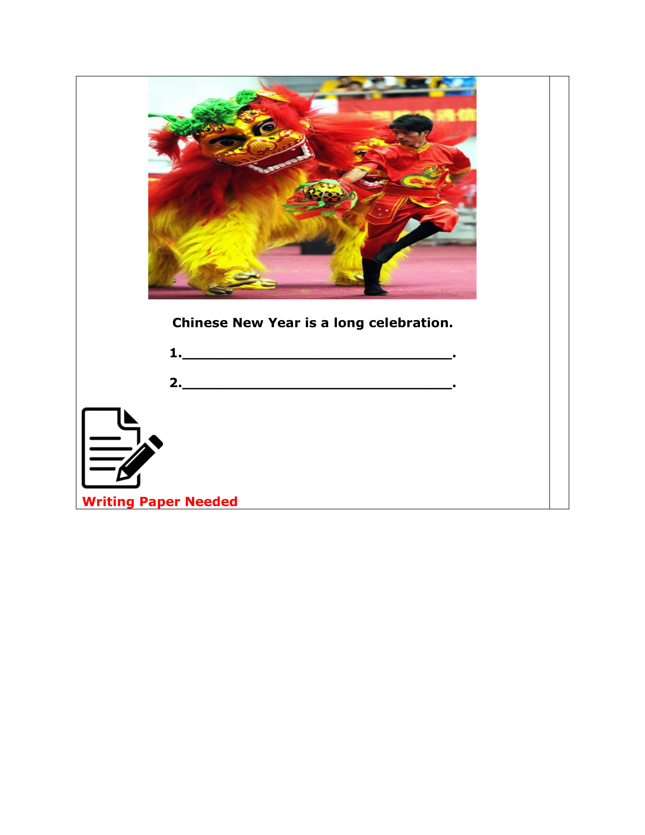 Let's write about what we learned. The first sentence is: Chinese New Year is a long celebration.