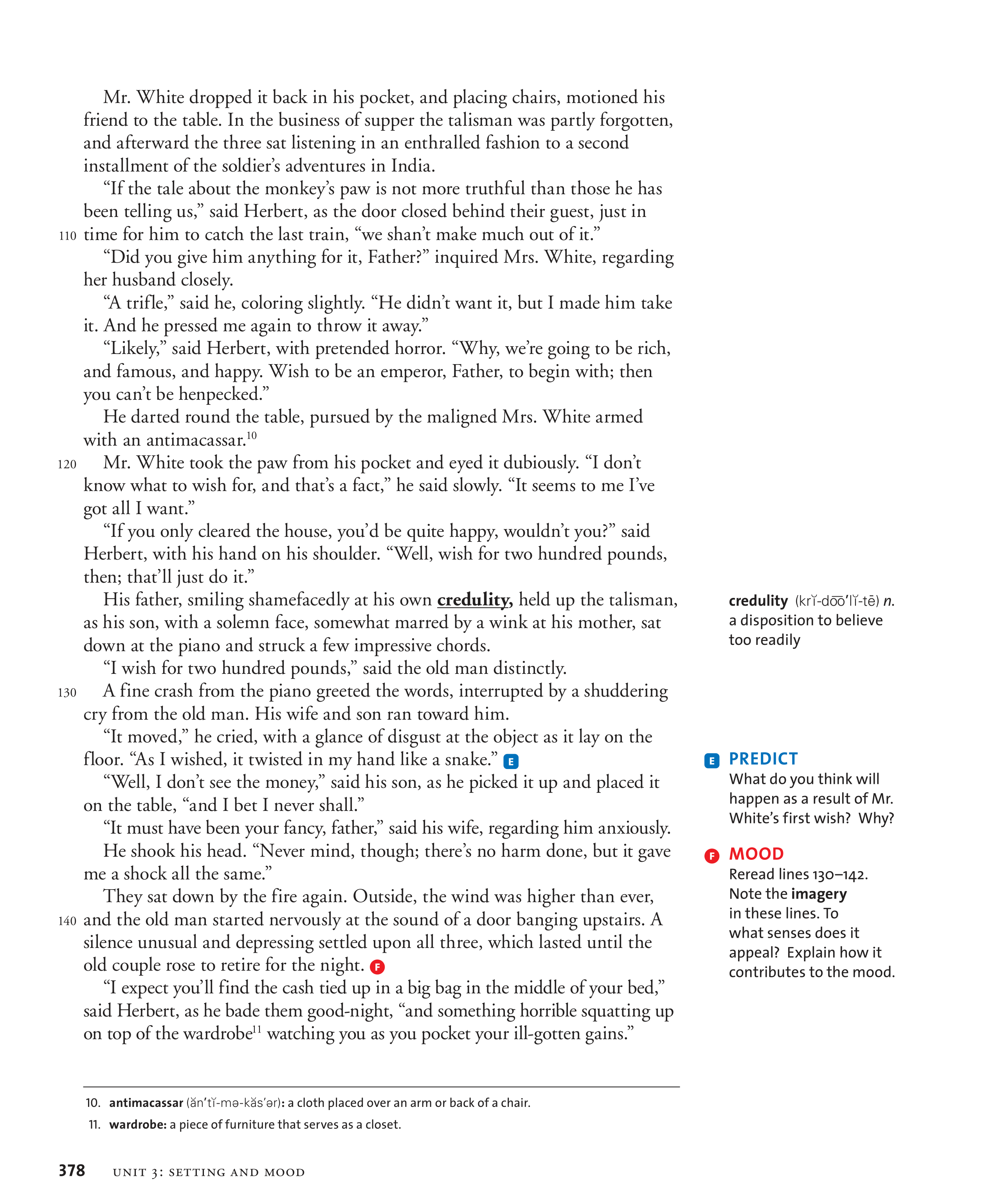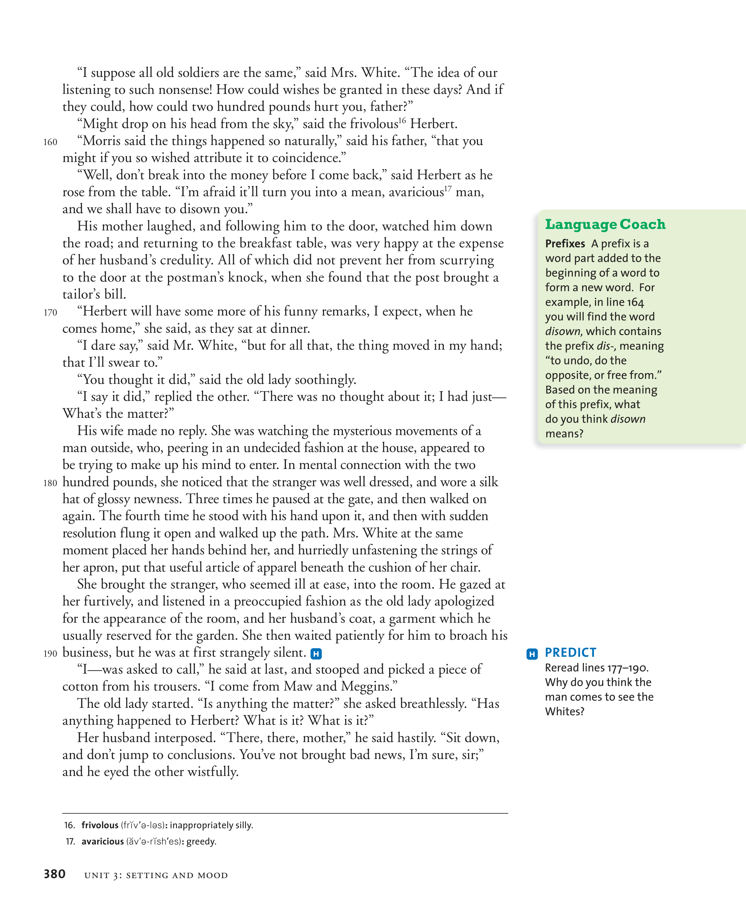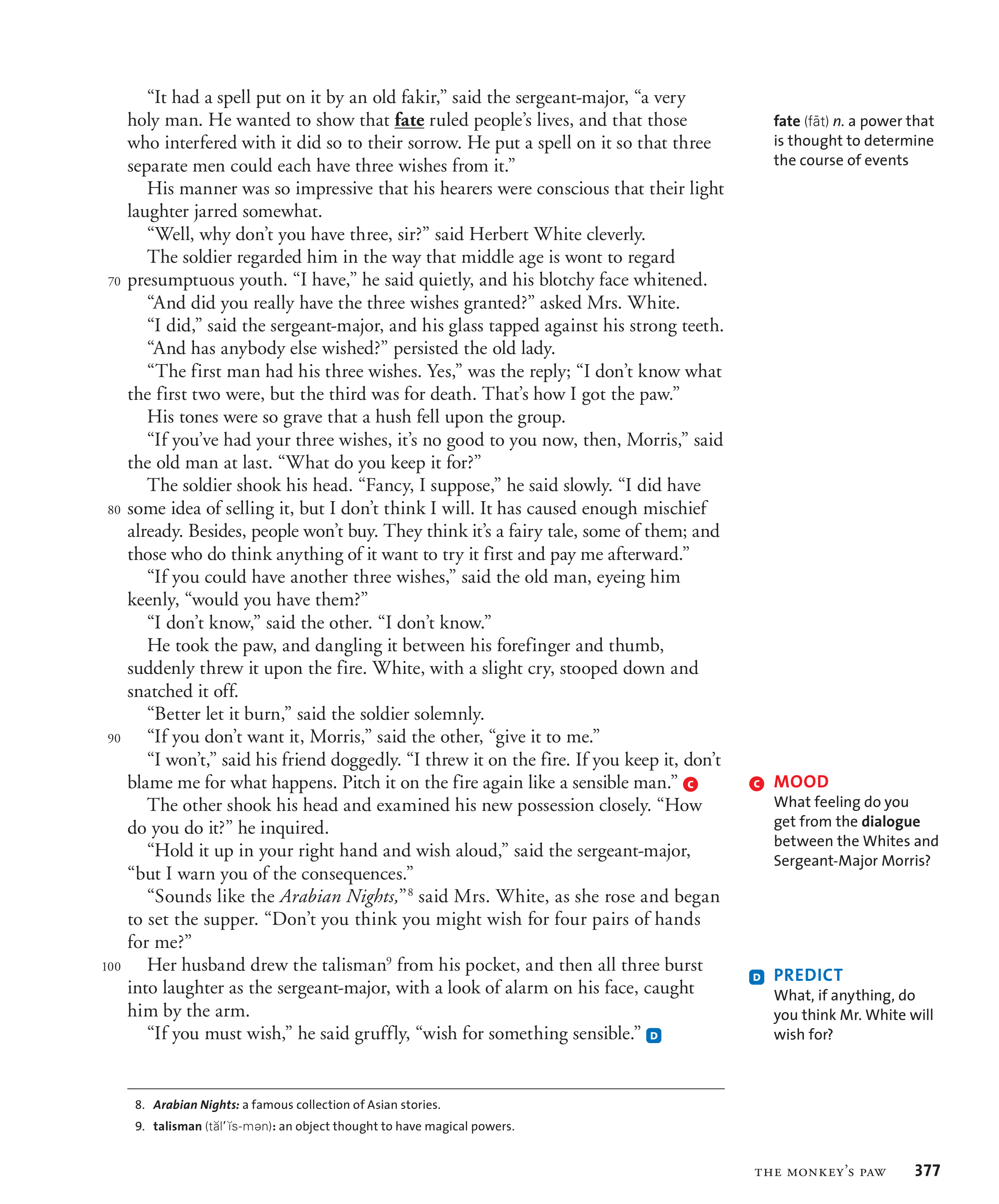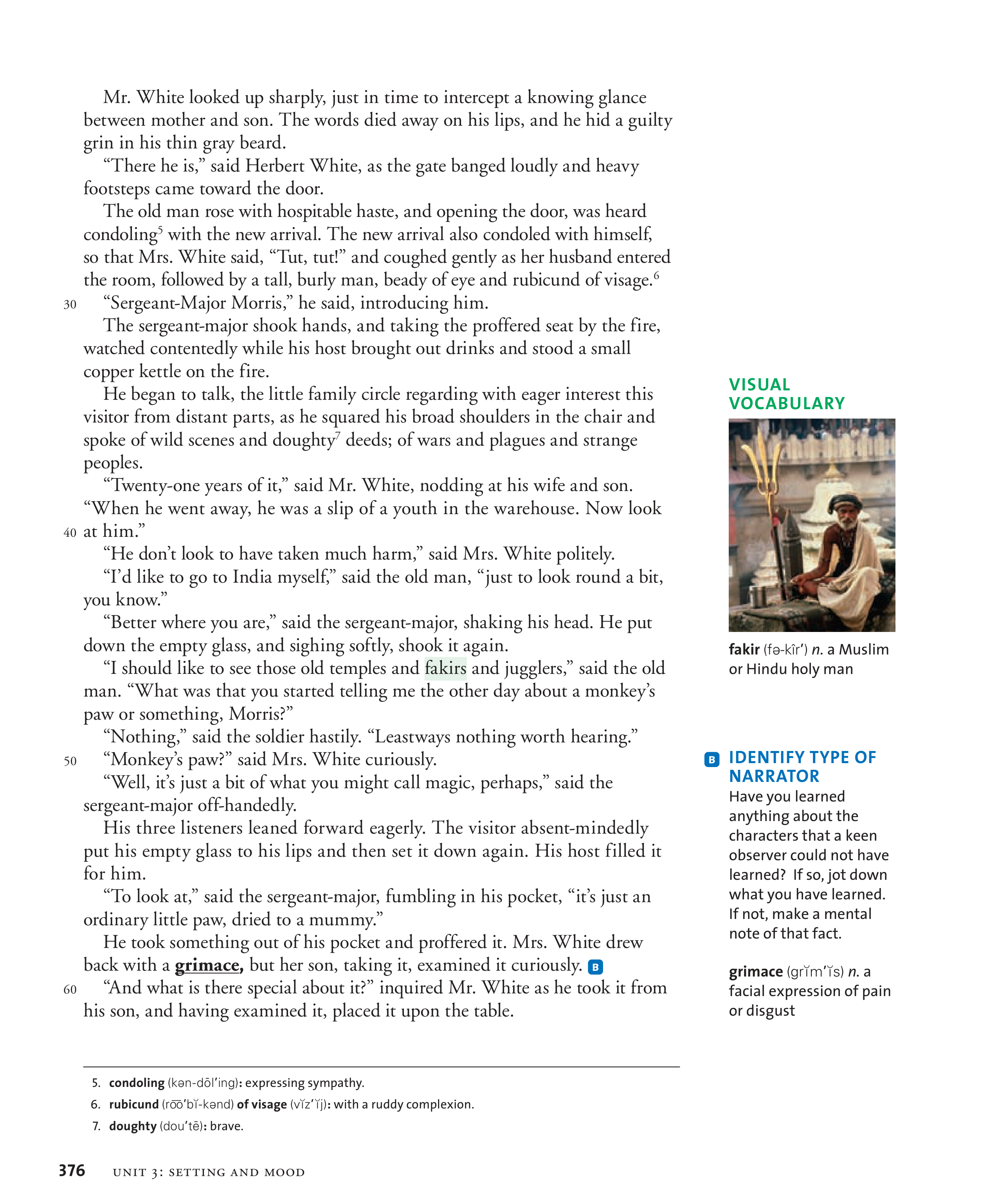 On page 1, Sergeant Major Morris and Mr. White are talking. Mr. White says, "I'd like to see those old temples, and fakirs and jugglers...What was that about a monkey's paw or something you started telling me about the other day, Morris?"
