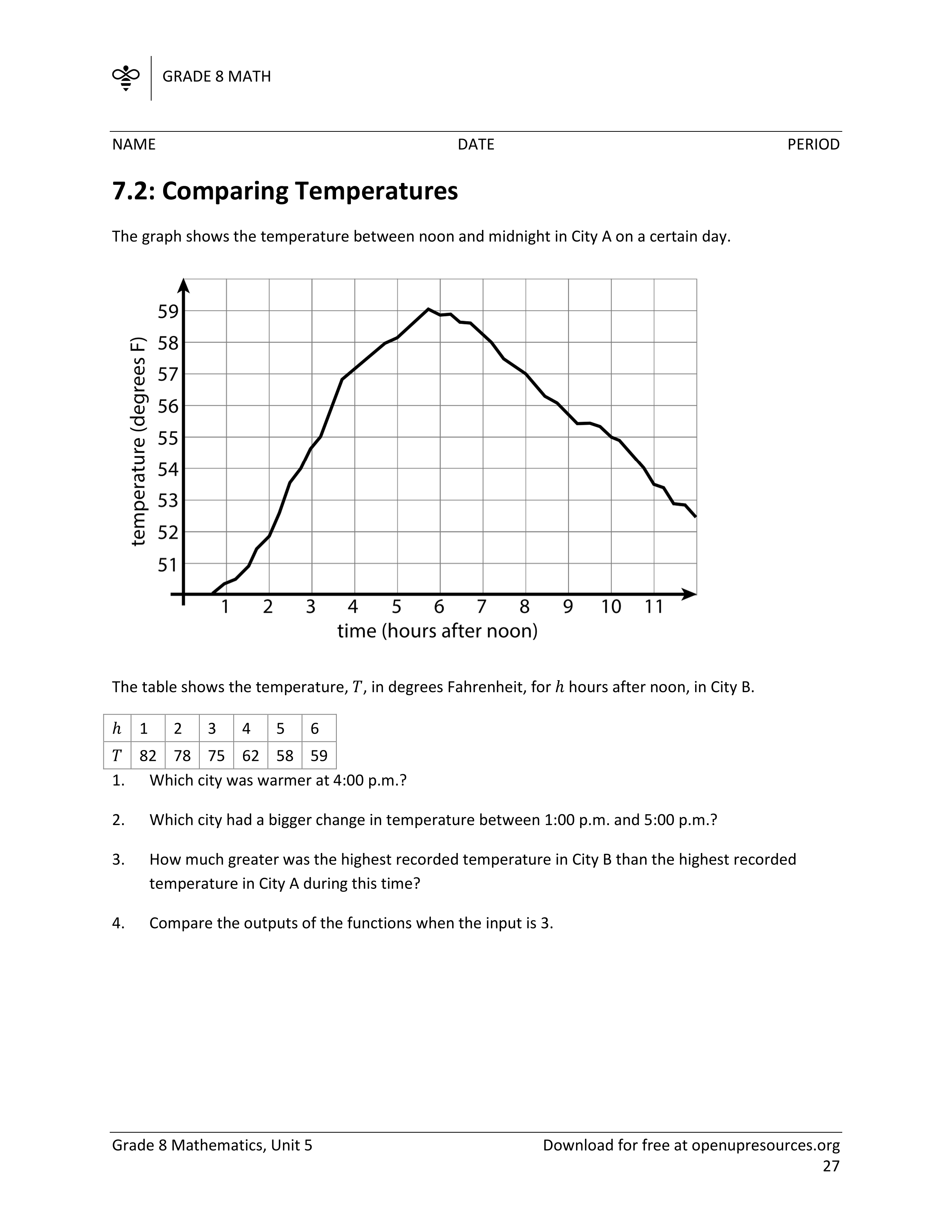 8.F.A.2 Compare properties of two functions each represented in a different way (algebraically, graphically, numerically in tables, or by verbal descriptions). For example, given a linear function represented by a table of values and a linear function represented by an algebraic expression, determine which function has the greater rate of change.