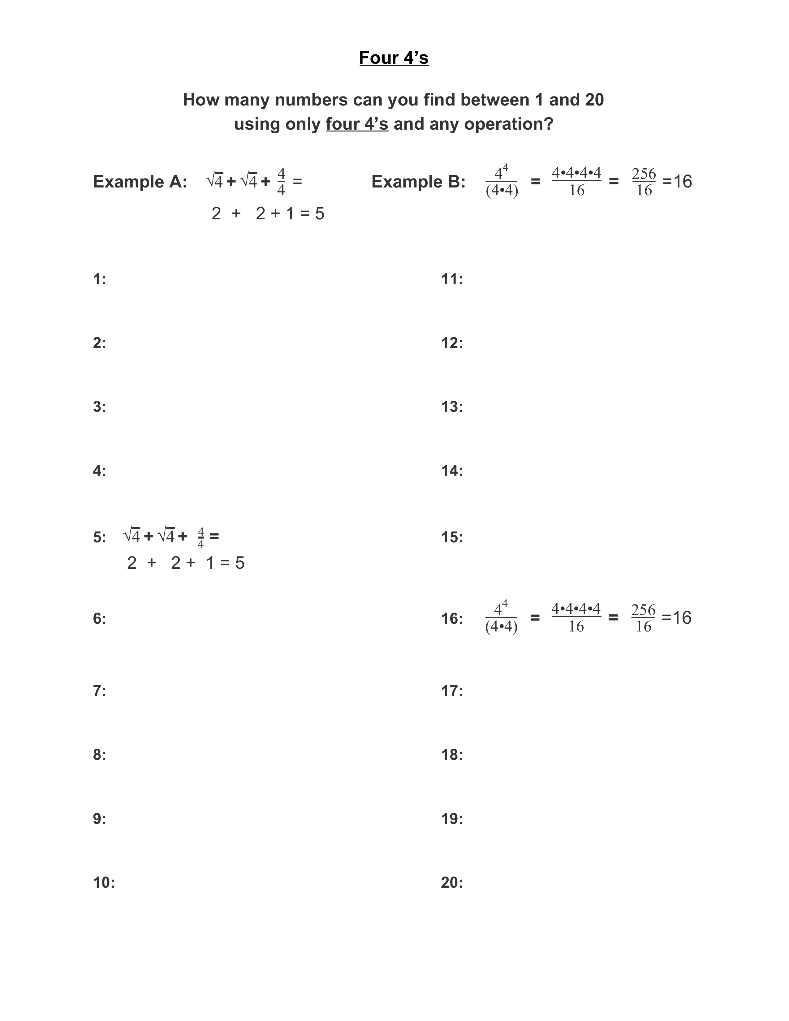 Using four 4's and any operation, students create expressions with whole number values from 1-20. Good for Order of Operations, evaluating expressions.