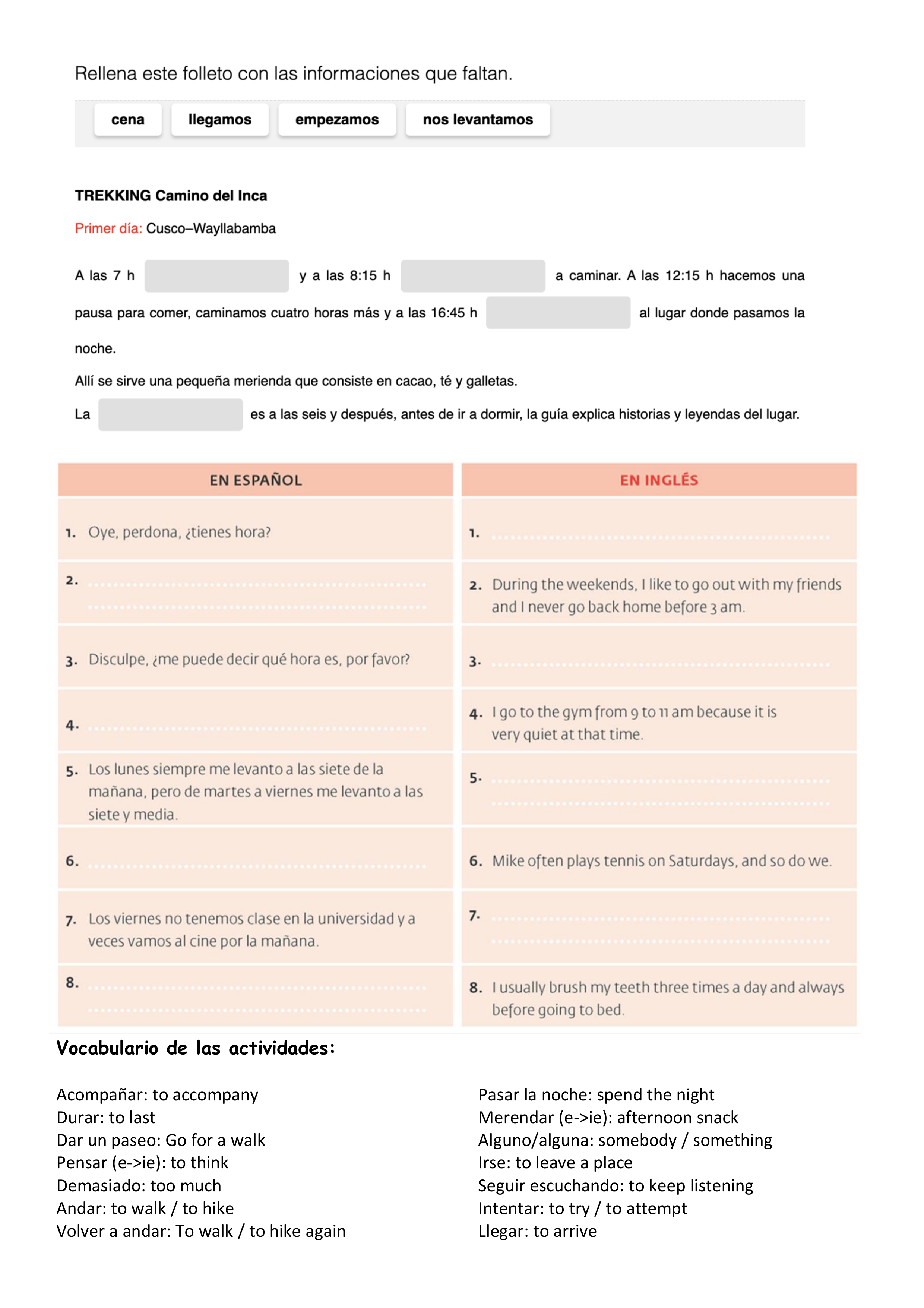 ¿A qué hora sales del colegio | arrow_right_alt | A las siete |