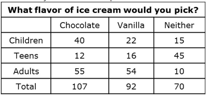 Jenna made the following two-way table about the color and size of the marbles in a bag.