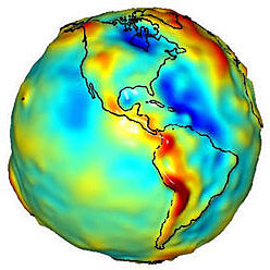 The GRACE mission helps scientists to create maps of gravity variations on Earth. Areas in blue have slightly weaker gravity and areas in red have slightly stronger gravity. Image credit: NASA/University of Texas Center for Space Research