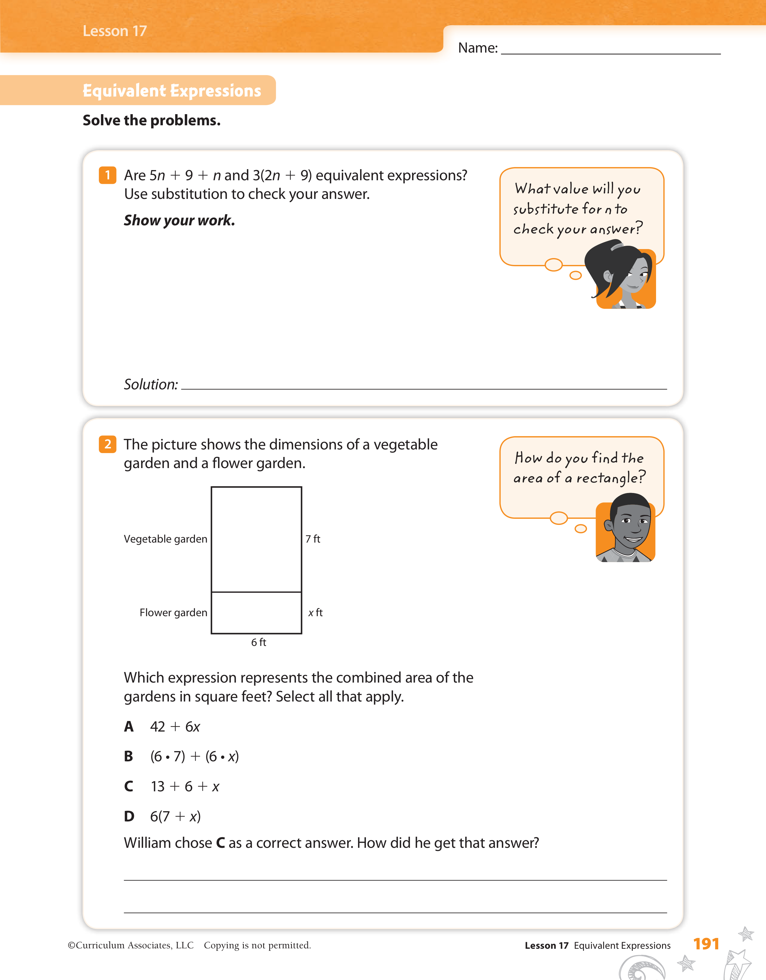Are 5n + 9 and 3(2n + 9) equivalent expressions? Use substitution to check your answer. Show your work.