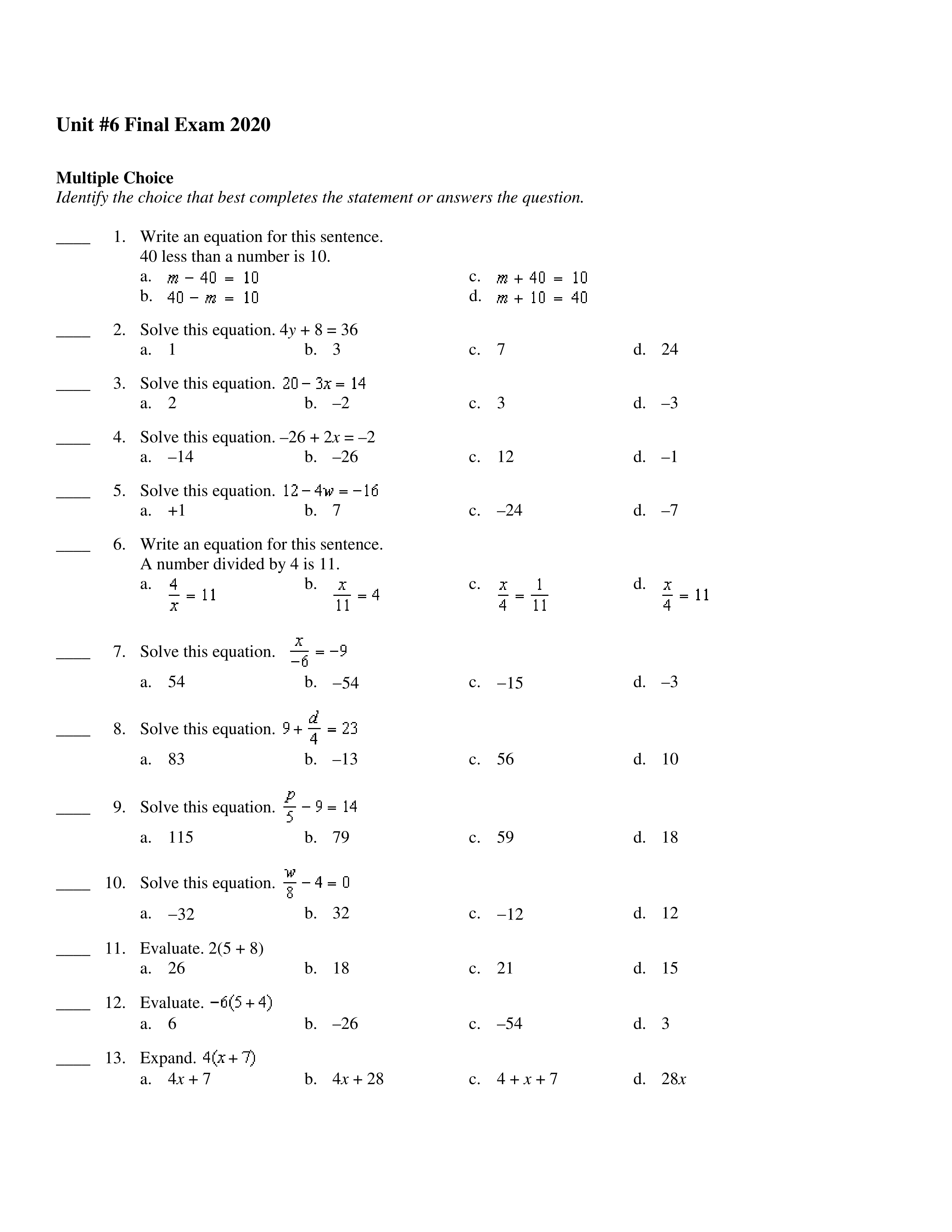 Find below the final exam for Unit 6. You will need to use some form of a calculator for some of the questions. Be sure and read ALL the questions fully as the answers may be on the next page from the page of the question (more specifically question #18).