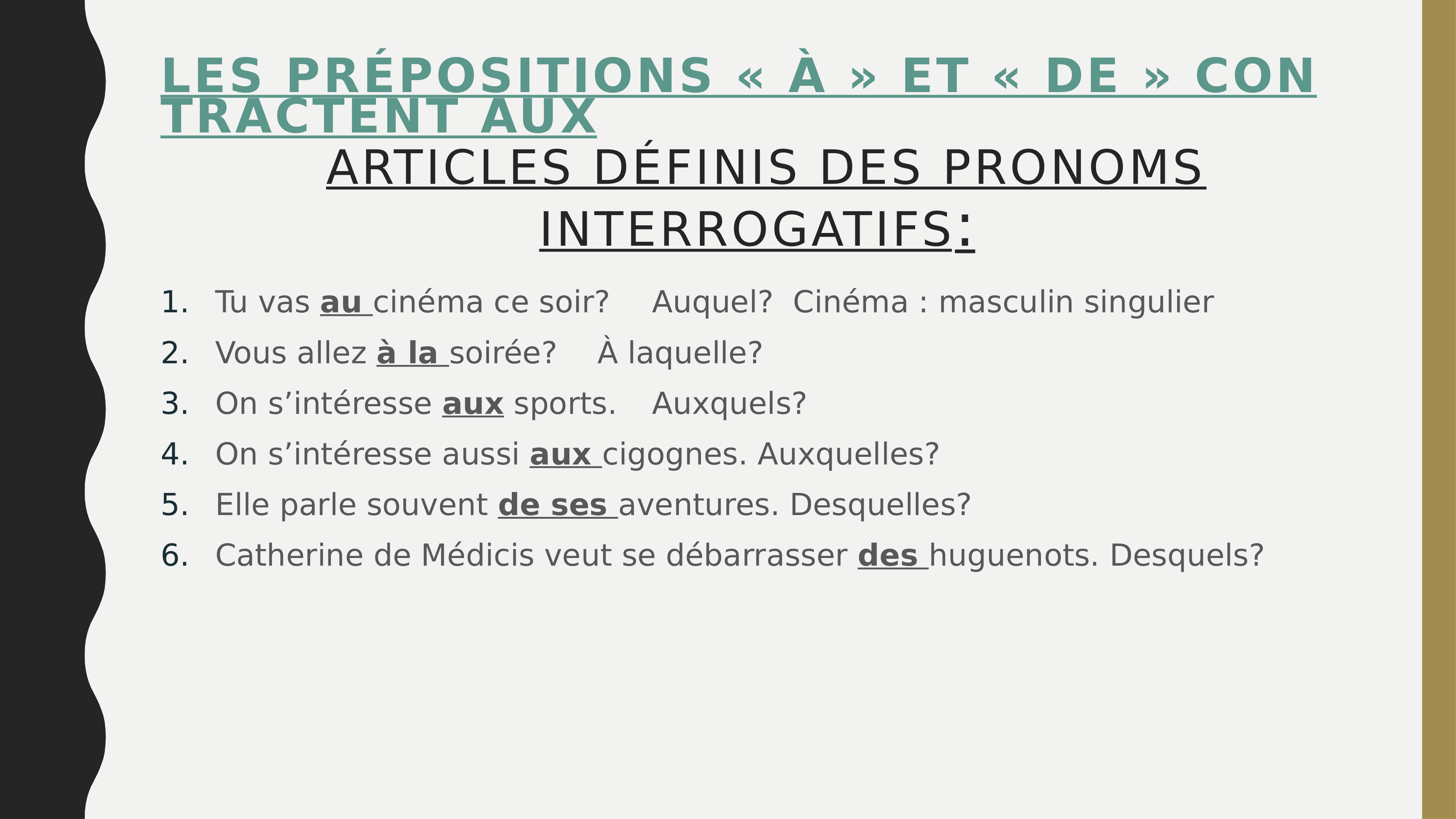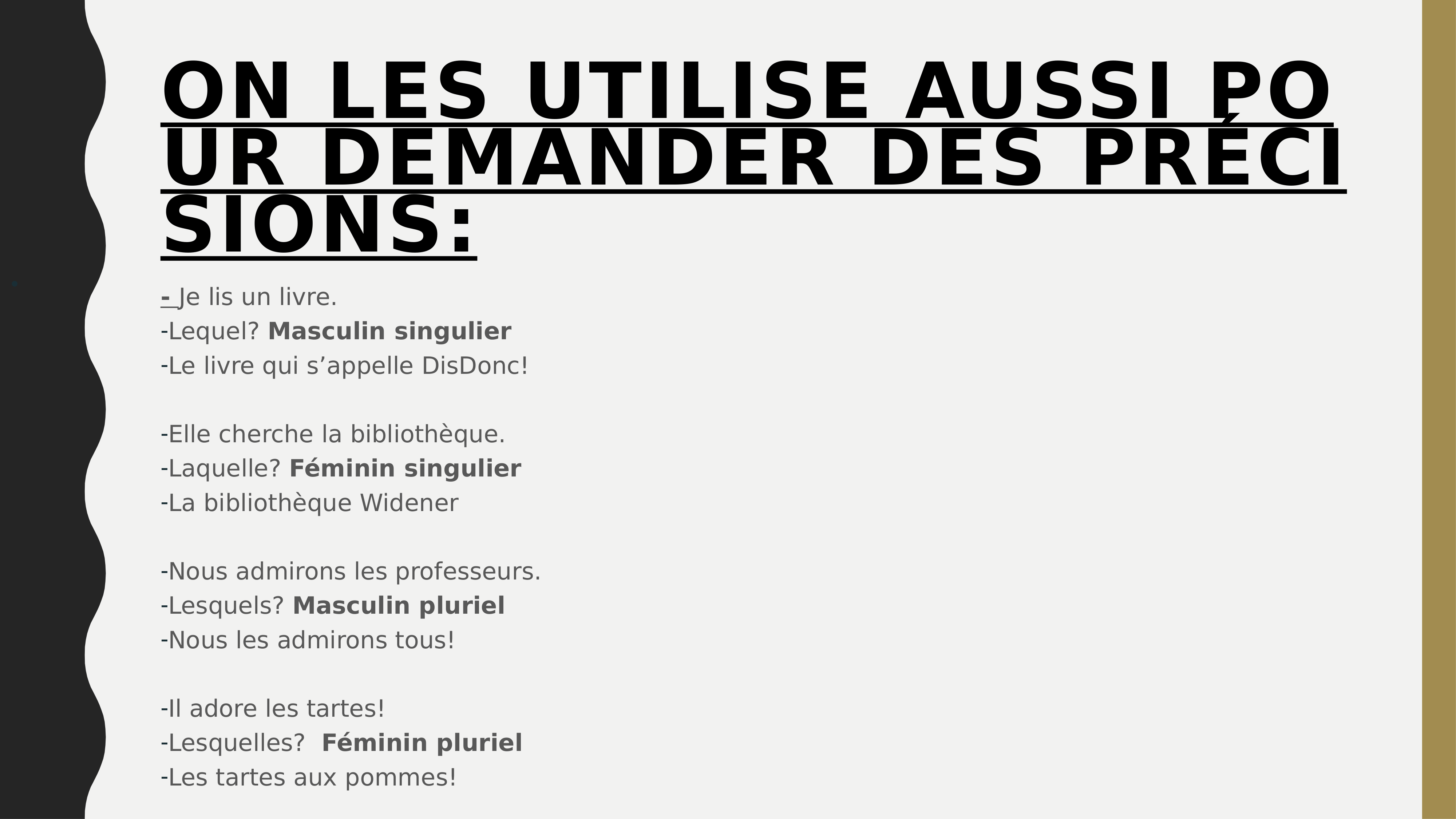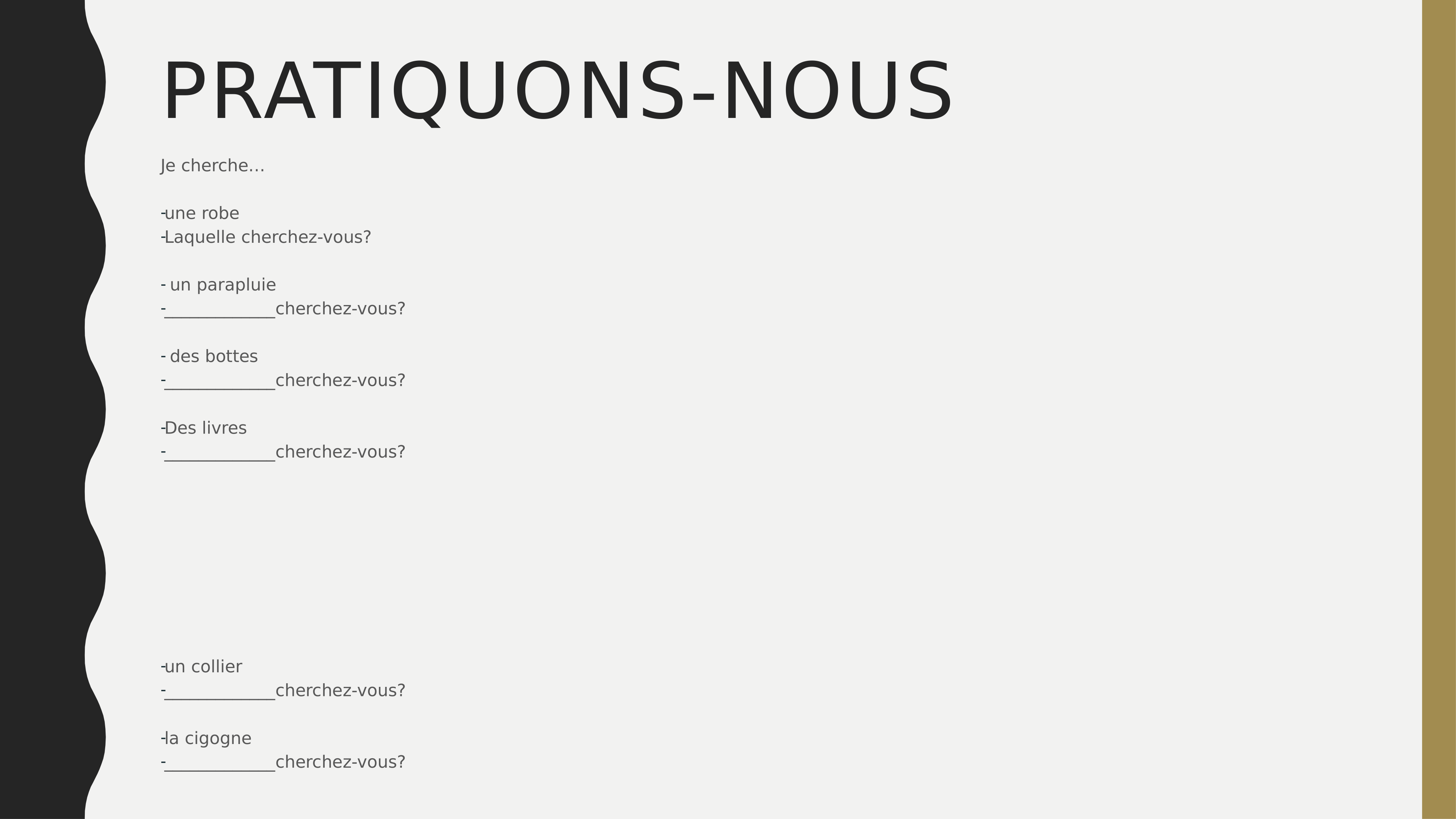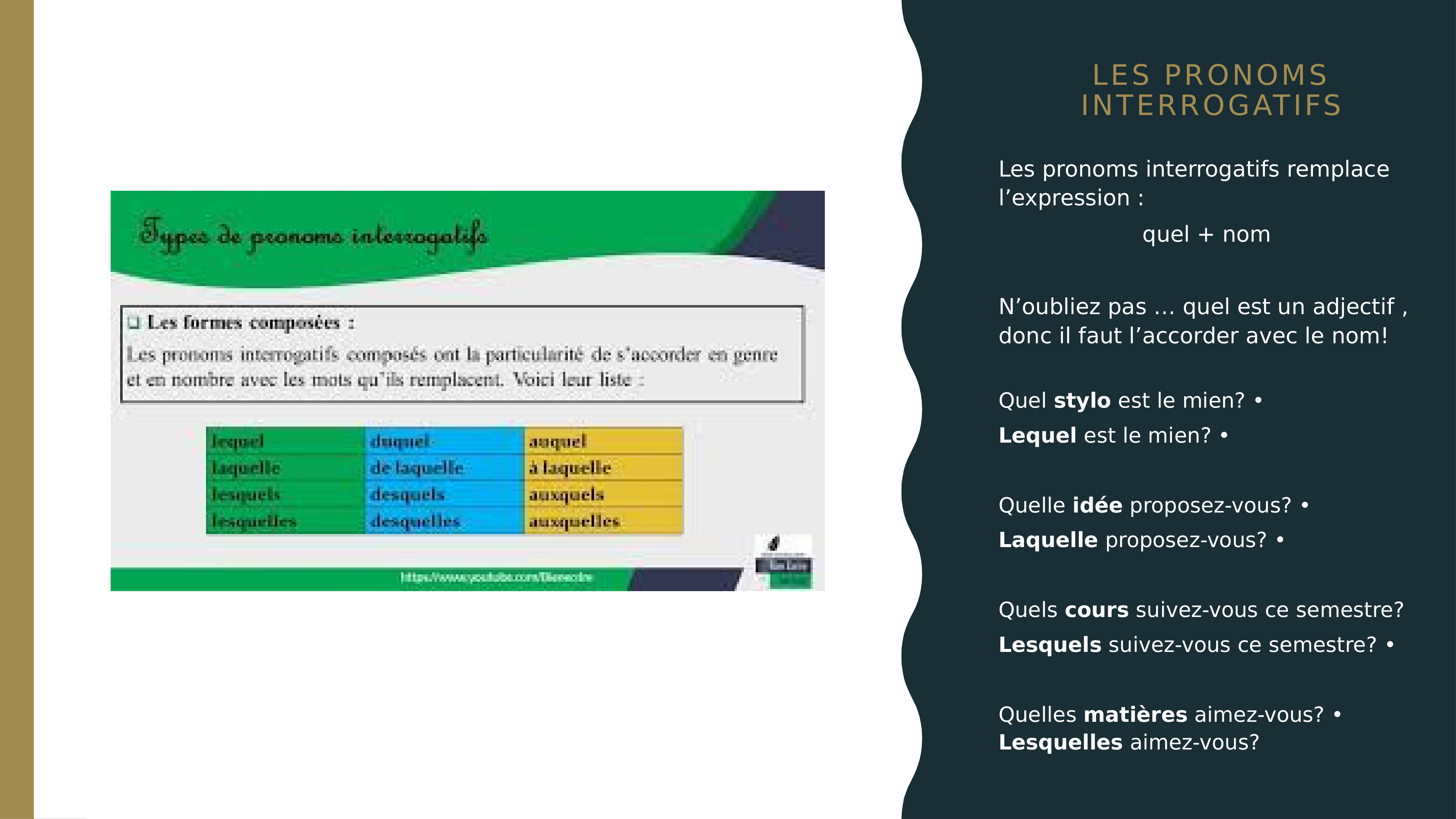 Associez le bon pronom interrogatif Exemple:Tu as trouvé mon sac de voyage? _________ lequel (signifie quel sac de voyage)