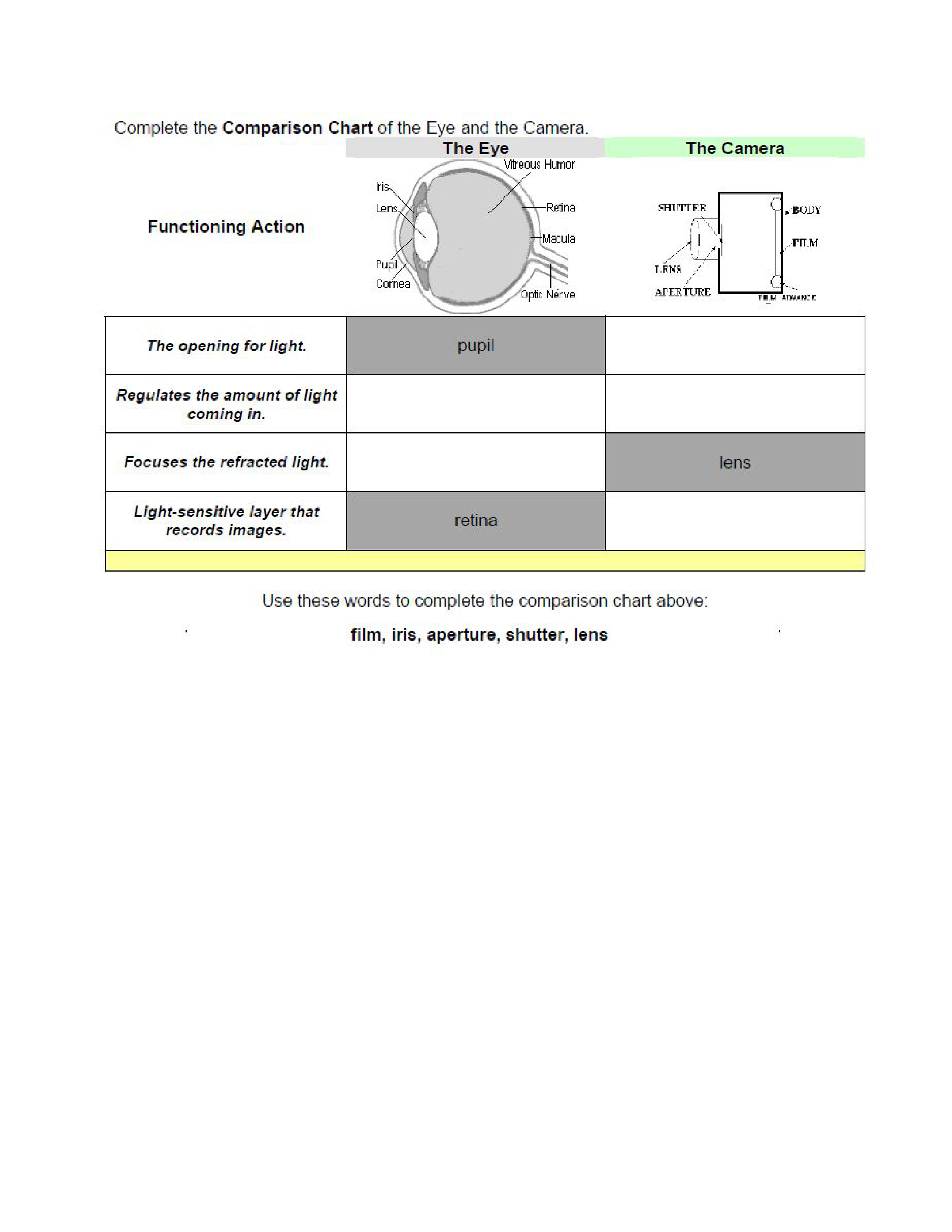 Use the following choices to best complete the comparison chart of the eye and the camera.