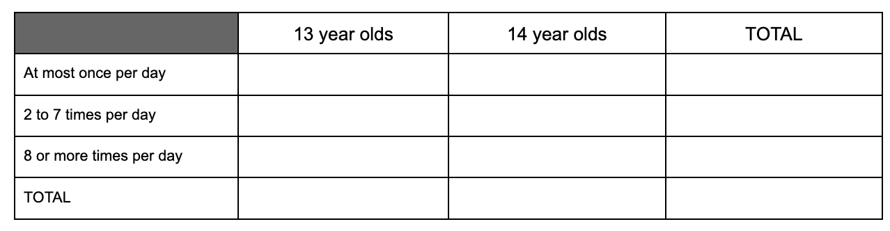 Of the 738 13 year-olds, 66 said they wash their hands at most once a day, 583 said two to seven times per day, and 89 said eight or more times per day.