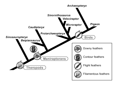 The cladogram indicating the first appearance of the four types of feathers is below.