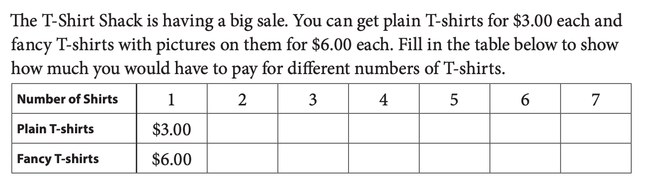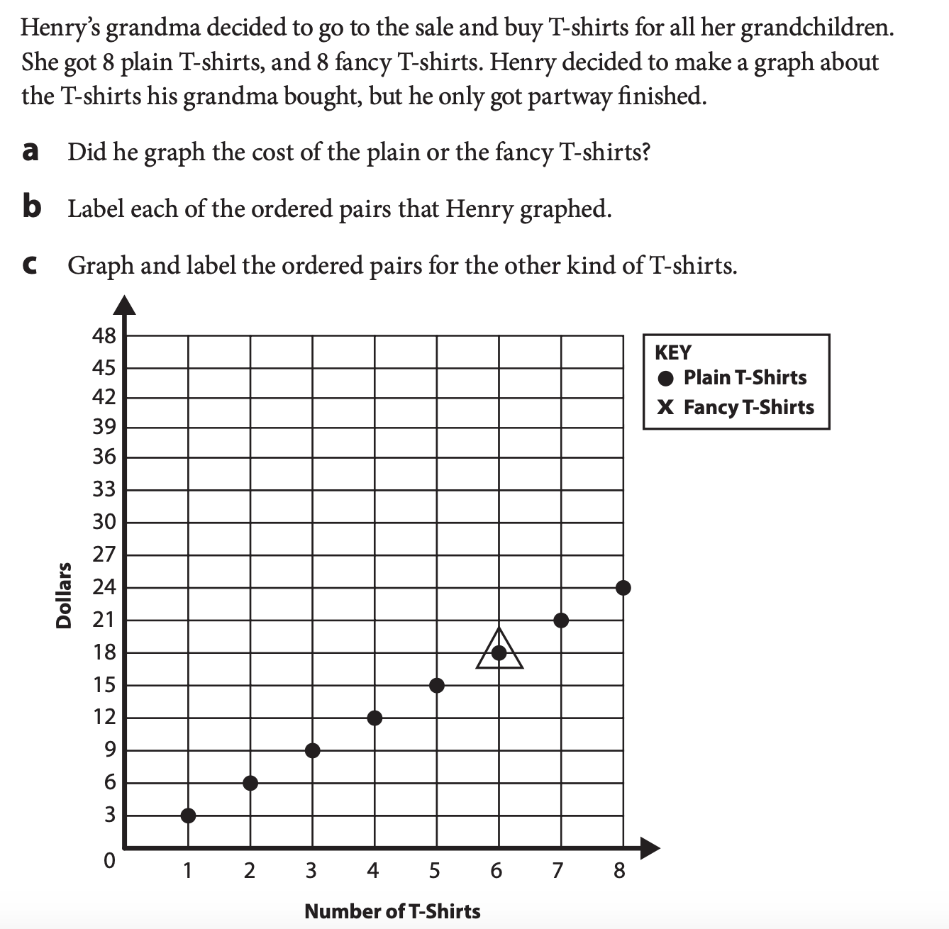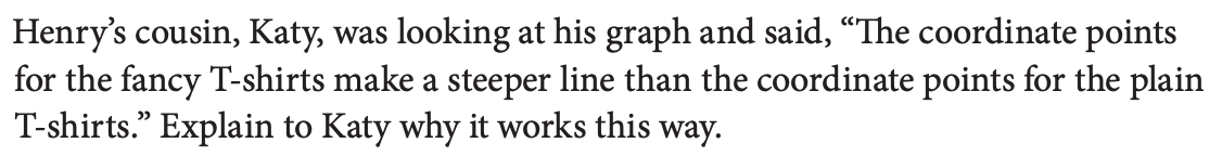 Henry’s cousin, Katy, was looking at his graph and said, “The coordinate points for the fancy T-shirts make a steeper line than the coordinate points for the plain T-shirts.” Explain to Katy why it works this way.