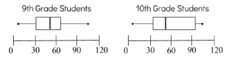 A sample of ninth and tenth grade students were asked how many minutes they spent online last night. The results were recorded in the box-and-whisker plots shown. What can you conclude?