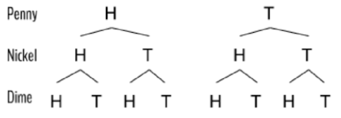 Mia tossed a penny, a nickel, and a dime. The following is a tree diagram for all the possible outcomes. What is the probability that she got a total of 2 heads and 1 tail?