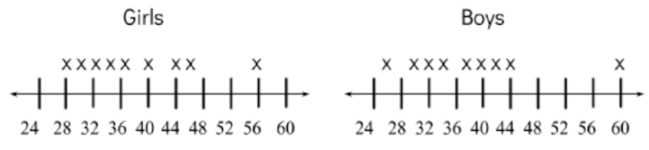 Jamika wanted to determine whether 10th grade boys or girls can swim faster. She decided to do an experiment where she randomly selected 9 boys and 9 girls to swim one lap. She recorded the time, in seconds, of each swimmer and then plotted the results of her survey.