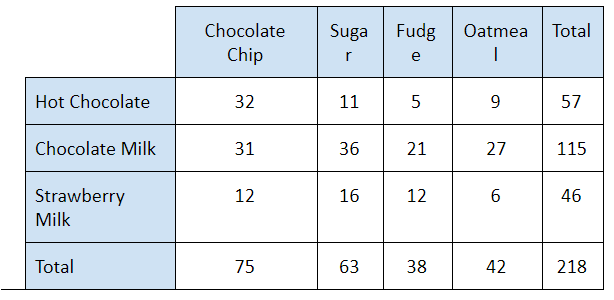 Suppose the manager wants to display the data based on percentages for the type of milk. What would the percentage for hot chocolate with chocolate chip cookie be?