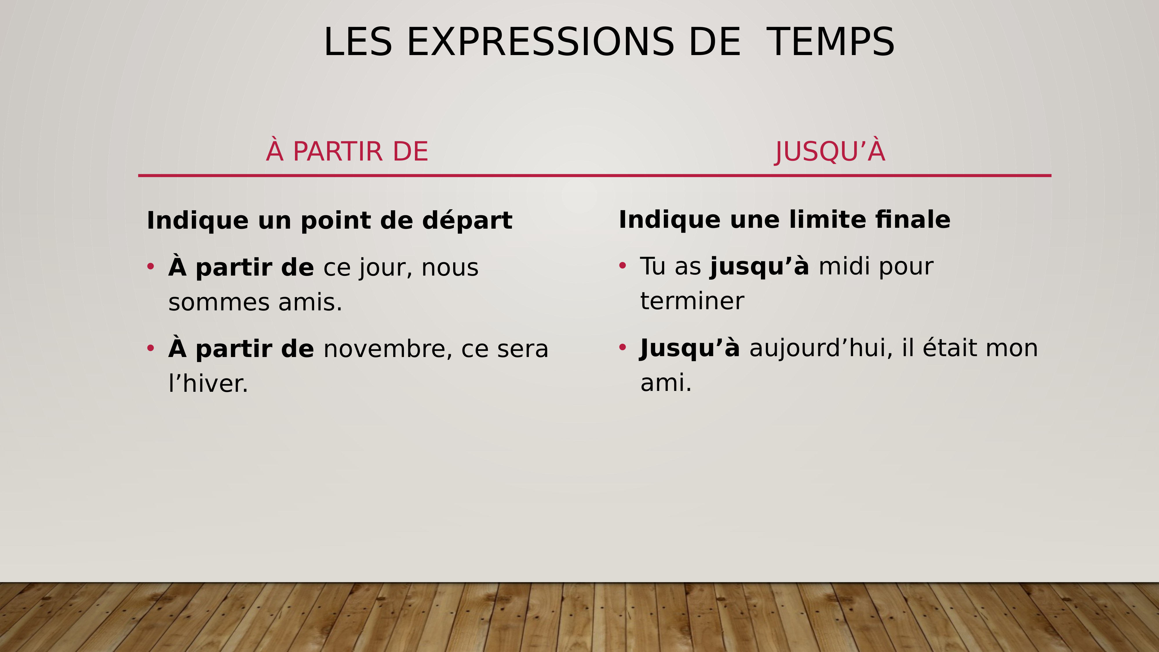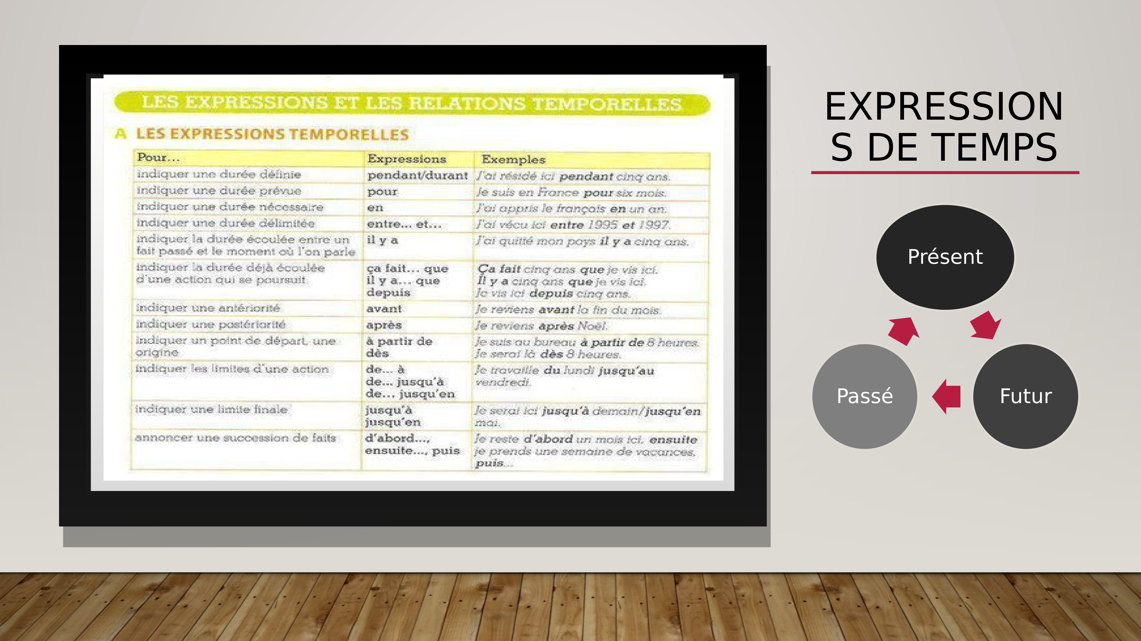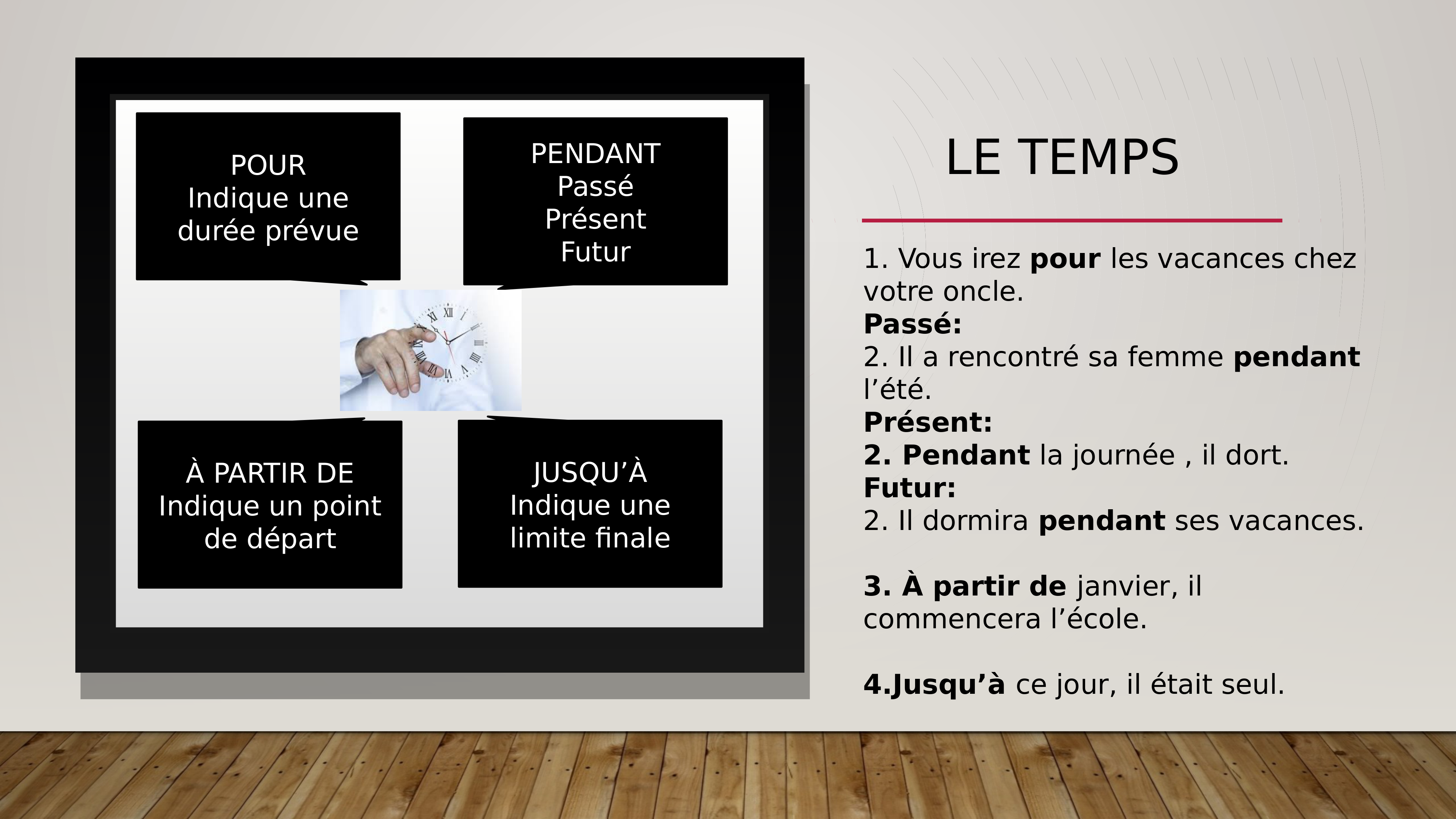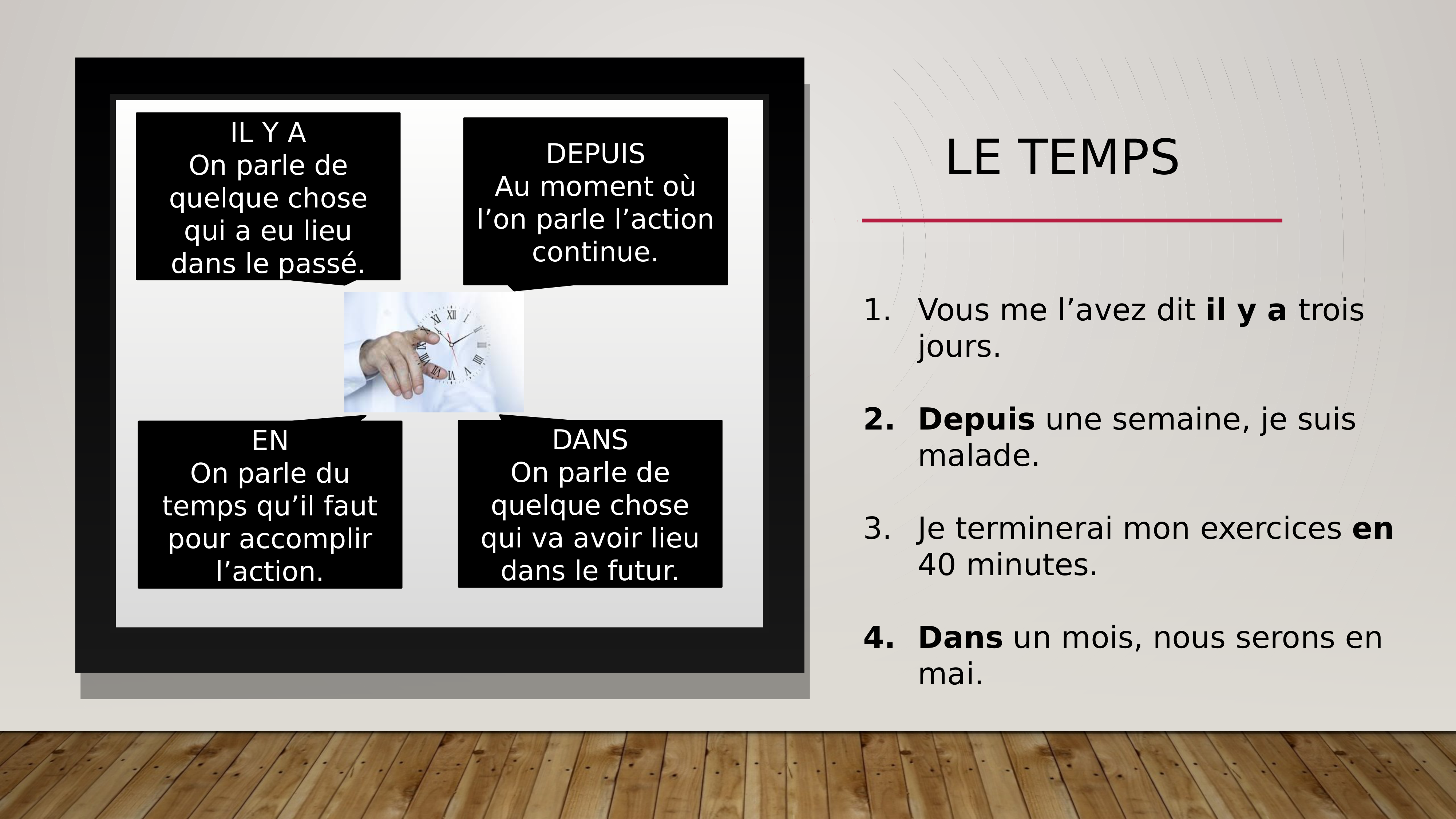 Depuis- il y a- pour-jusqu'à- en- pendant-dans.