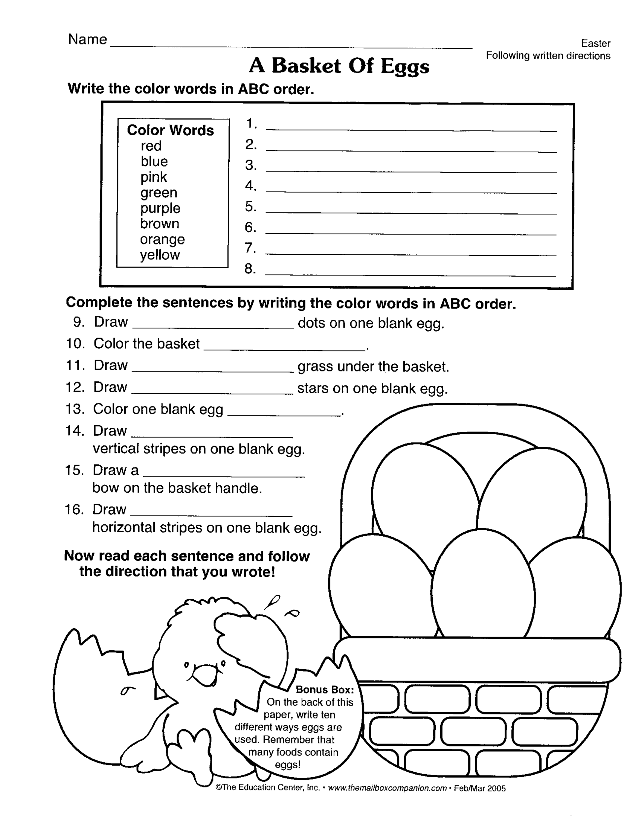 Choose the word that completes the sentence. Look at the directions on the sheet. Use your answers from the box above to put the words in ABC order in these sentences.
