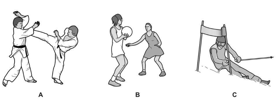The diagrams, A to C, show performers from different sports. For each sport name a different component of skill related fitness and explain why it is required.