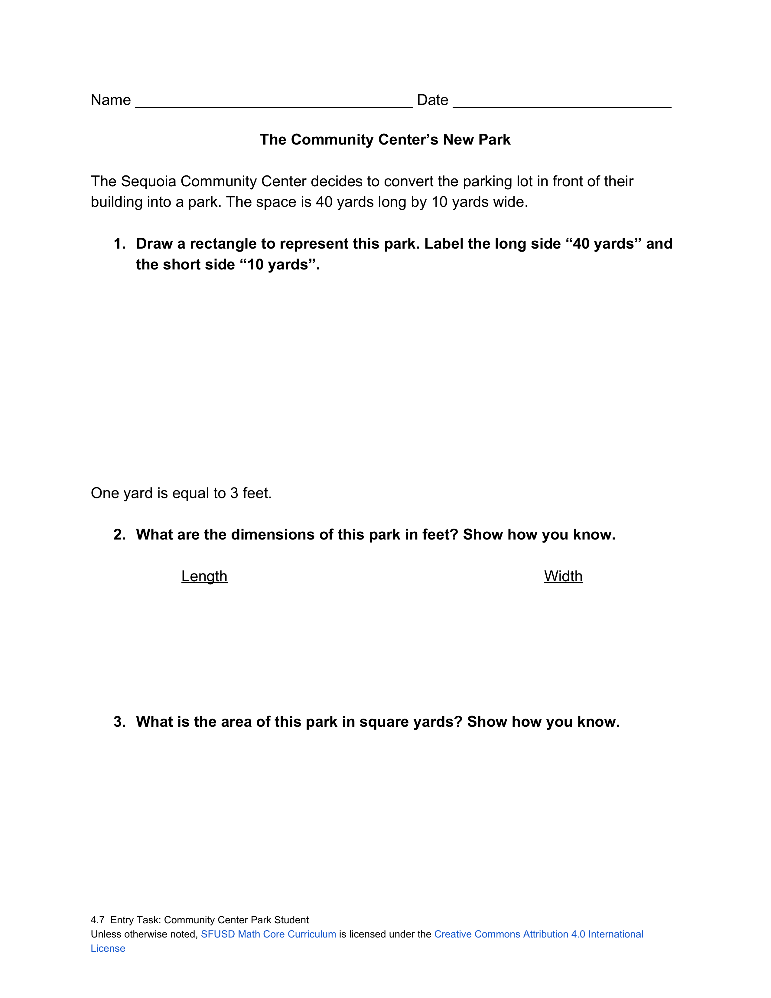 Draw a rectangle to represent this park. Label the long side "40 yards" and the short side "10 yards."