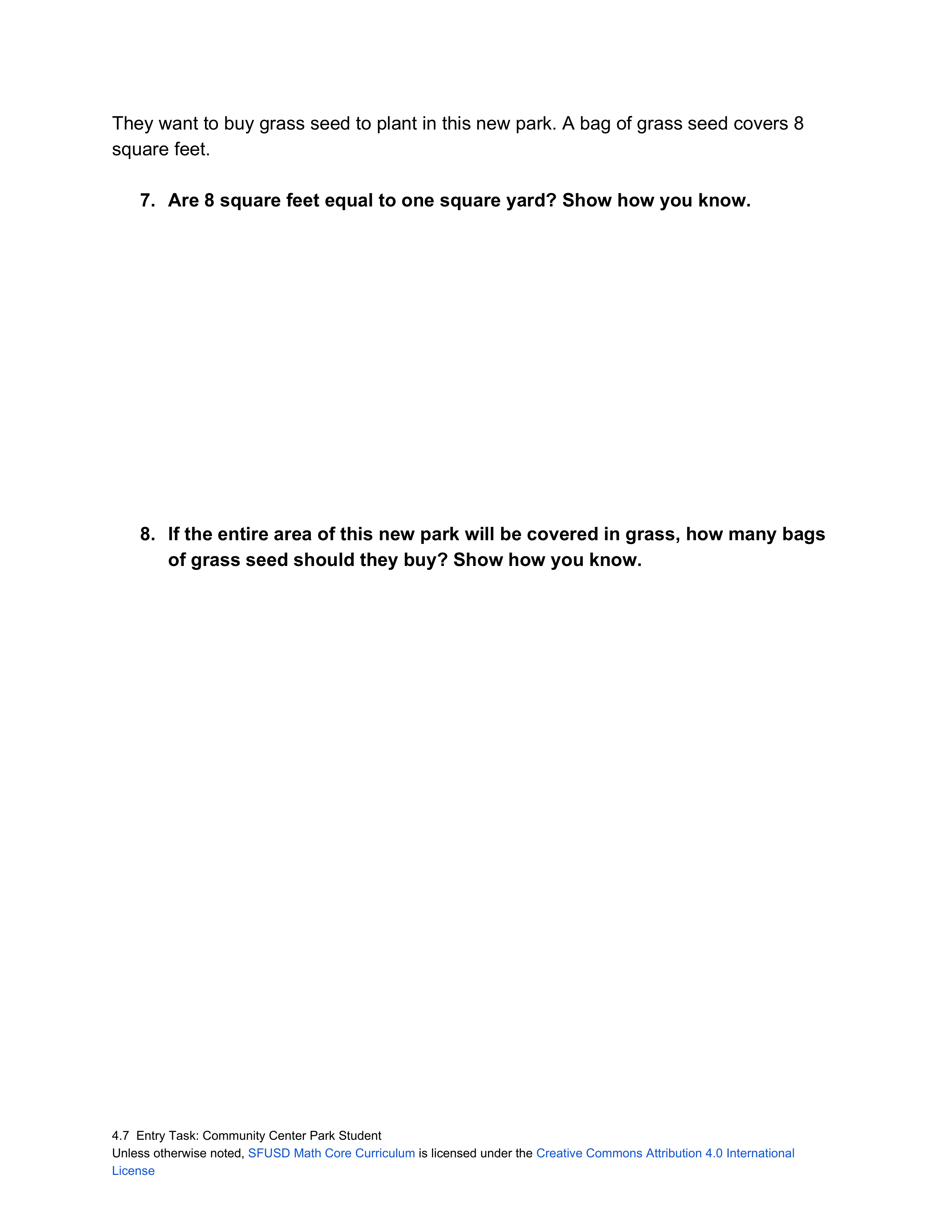 If the entire area of this new park will be covered in grass, how many bags of grass seed should they buy? Show how you know.